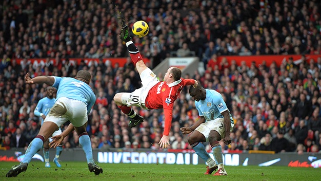 | Một trong những khoảnh khắc đáng nhớ nhất trong sự nghiệp của Rooney là cú tung người móc bóng vào lưới Man City ngày 12/2/2011. |