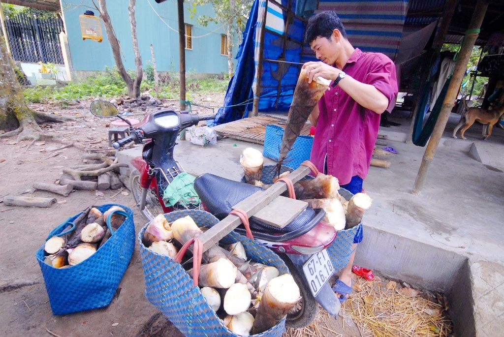 | Ông Lê Văn Đủ, ở ấp Vồ Đầu, xã An Hảo, huyện Tịnh Biên có 1,8 ha đất rừng trên Núi Cấm. Khi cây rừng đã bén đất và bắt đầu phát triển thì ông cũng trồng xen tre mạnh tông lấy măng. Mười năm qua, gia đình ông sống chủ yếu nhờ thu hoạch măng từ 1.000 bụi tre này. “Vào vụ cứ 4-5 ngày, gia đình tôi thu hoạch một đợt măng 400-500kg. Lúc rộ nhất khoảng tháng 7 đến 8 âm lịch được 2 tấn mỗi đợt, thu nhập cũng khá lắm nhưng lúc rớt giá thì đầu ra khá vất vả”, ông Son nói. Ước tính mỗi vụ, gia đình ông thu nhập từ 150 - 200 triệu đồng. |