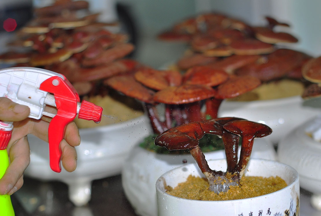 | Theo anh Tuấn, linh chi được trồng và chăm sóc trong môi trường đặc biệt suốt 4 tháng. Khi chúng ra tán rộng, đẻ nhánh thì tách khỏi phôi để chuyển sang chậu sứ. |