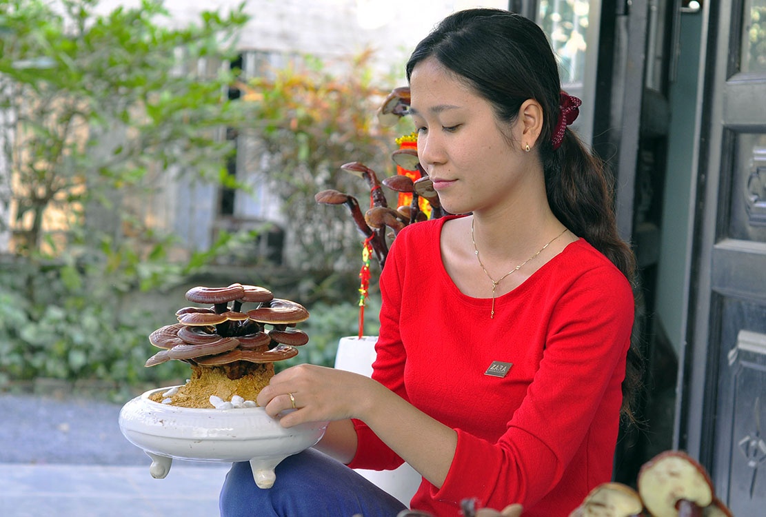 Sau 4 tháng, những cây nấm linh chi lớn được đưa ra chậu sứ để trồng, tạo dáng bonsai chơi Tết. Cây cảnh có màu sắc đẹp, sống lâu gợi sự hưng phát, trường thọ.