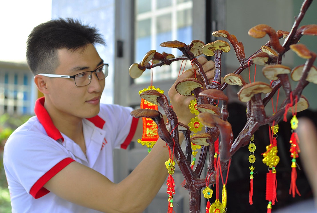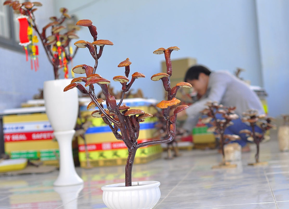 | Nấm linh chi là dược liệu quen thuộc, có giá trị kinh tế cao. Phát hiện nấm có màu sắc đẹp, chủ trại nấm linh chi Lê Anh Tuấn (30 tuổi, ngụ xã Bình Minh, huyện Trảng Bom, Đồng Nai) đã biến loại dược liệu này thành cây cảnh, tạo thế bonsai phục vụ cho khách hàng dịp Tết.