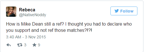 | "Không rõ liệu Mike Dean có còn là trọng tài nữa không? Thiết nghĩ ông ấy nên công khai đội bóng ông ấy hâm mộ và xin không bắt những trận đấu có đội bóng ấy nữa. |
