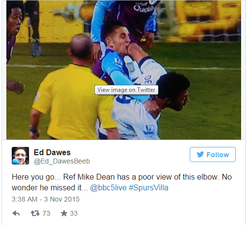 "Xem này. Trọng tài Mike Dean có một vị trí đứng quá thuận lợi để quan sát cú thúc cùi chỏ. Không hiểu vì sao ông ta lại bỏ qua". |