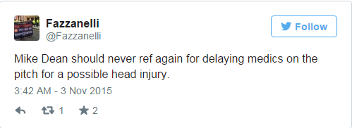"Mike Dean có lẽ nên giã từ sự nghiệp cầm còi vì không cho đội ngũ y tế vào chăm sóc cầu thủ bị chấn thương rất rõ ràng ở đầu". |