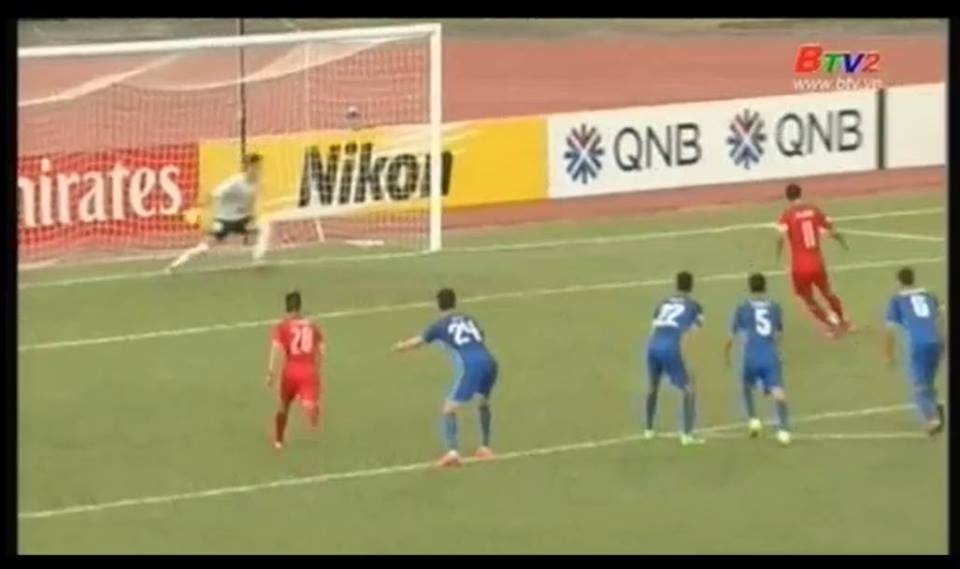 Sau đó, Anh Đức (số 11) cũng chính là người thực hiện cú sút phạt 11 m. Quả bóng vàng Việt Nam 2015 dứt điểm chính xác, hạ gục thủ thành