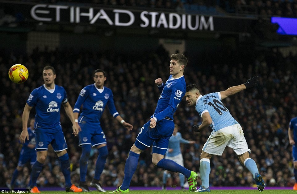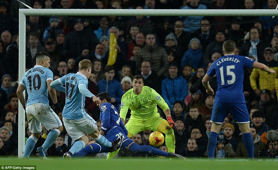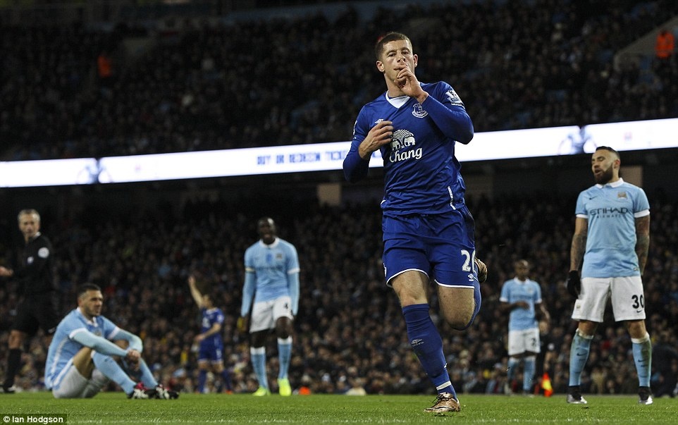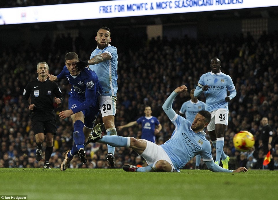 | Sau khi trận đấu diễn ra 18 phút, Ross Barkley đi bóng qua hai cầu thủ Man City và dứt điểm chìm ghi bàn cho Everton. |