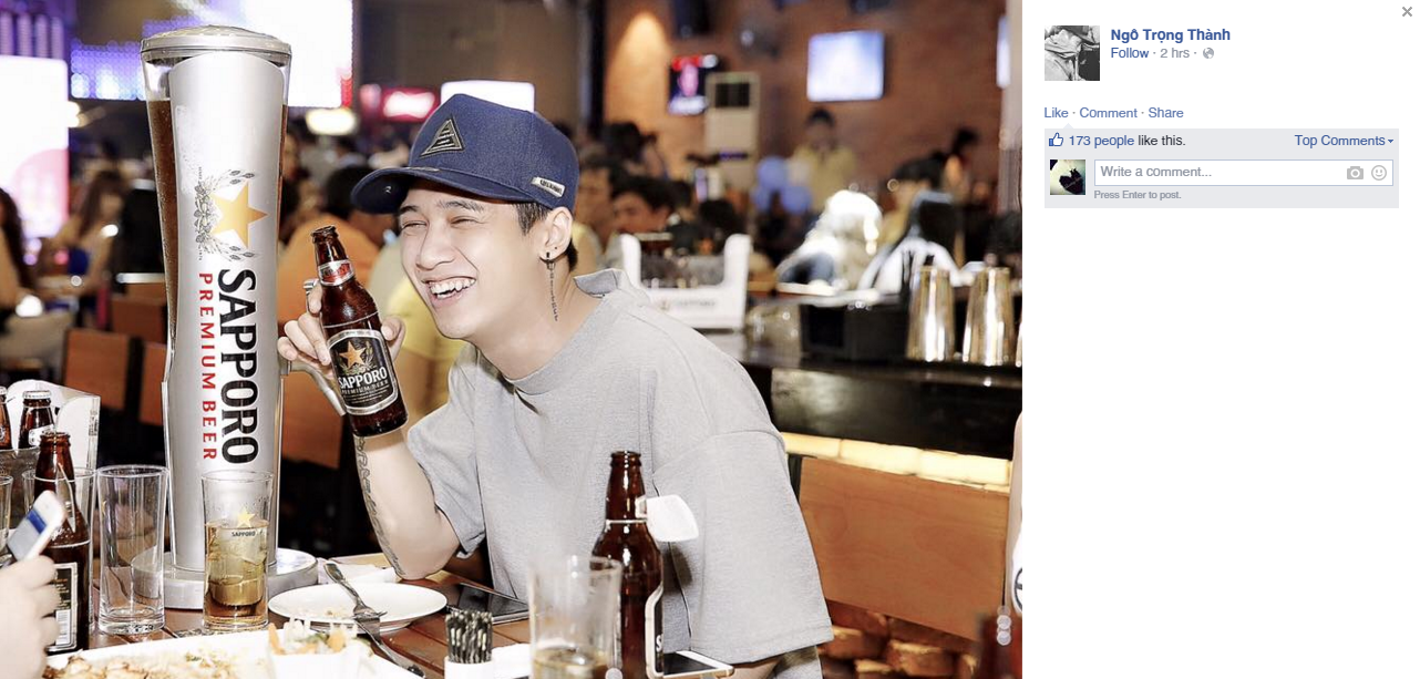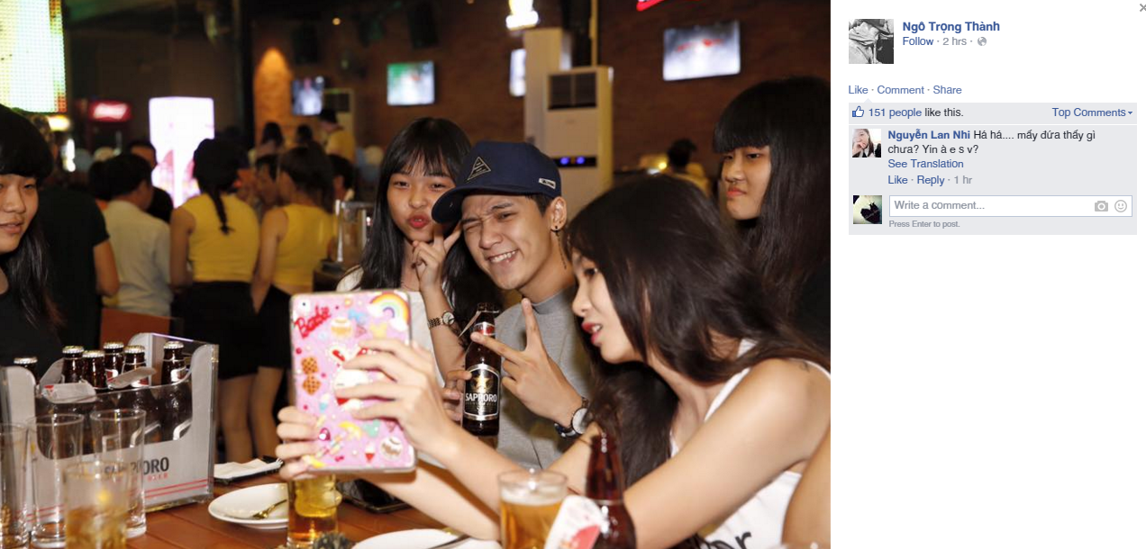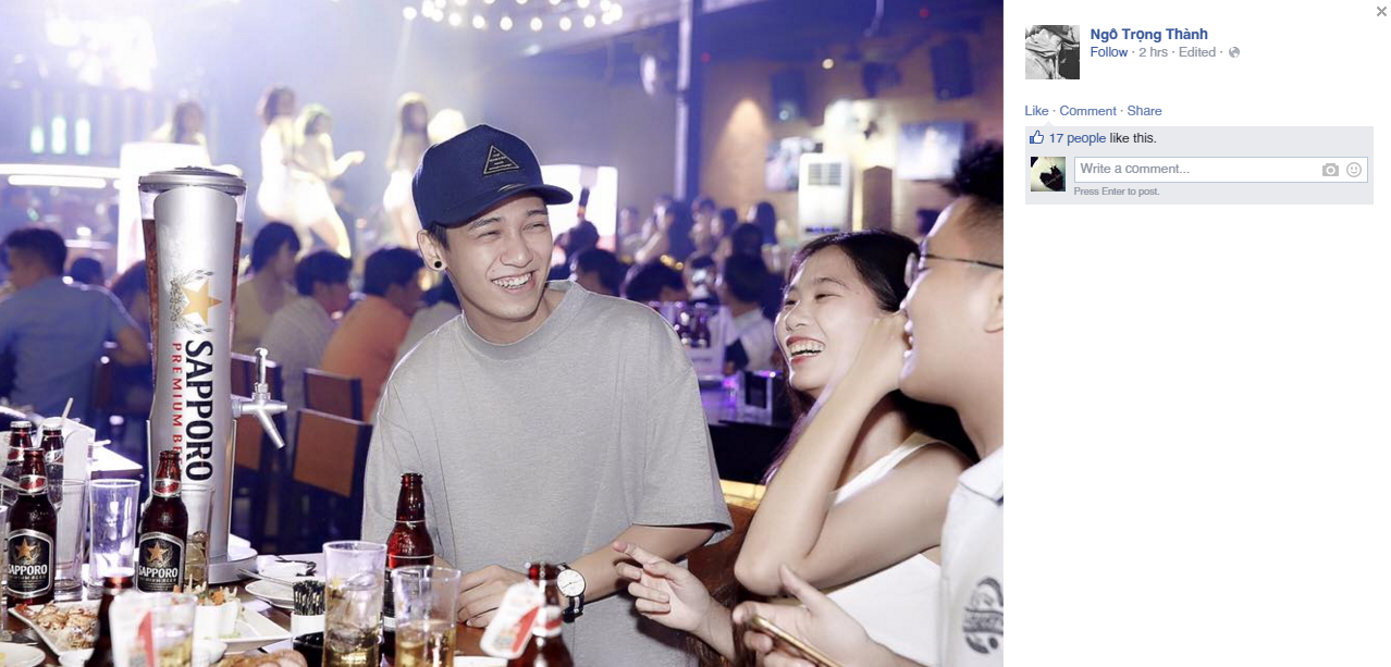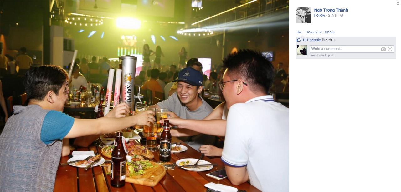 | Đến với bữa tiệc Sapporo Party tại Yoyo beer garden, Tronie mặc áo thun xám dài và quần jeans đen. Chàng ca sĩ đã cùng bạn bè đến đây để đắm mình trong từng giai điệu cuồng nhiệt, ăn uống tán gẫu và nâng những ly bia mát lạnh vào cuối tuần. Tronie Ngô phấn khích khoe ảnh với fan trên Facebook. |