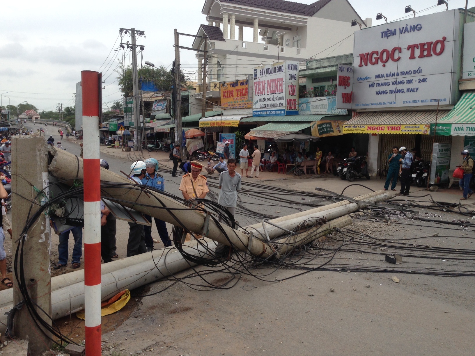 3 trụ điện cao thế cái thì bật gốc, cái thì gãy ngang thân, đổ sập xuống đường. Nhiều người tham giao thông hoảng loạn tháo chạy.