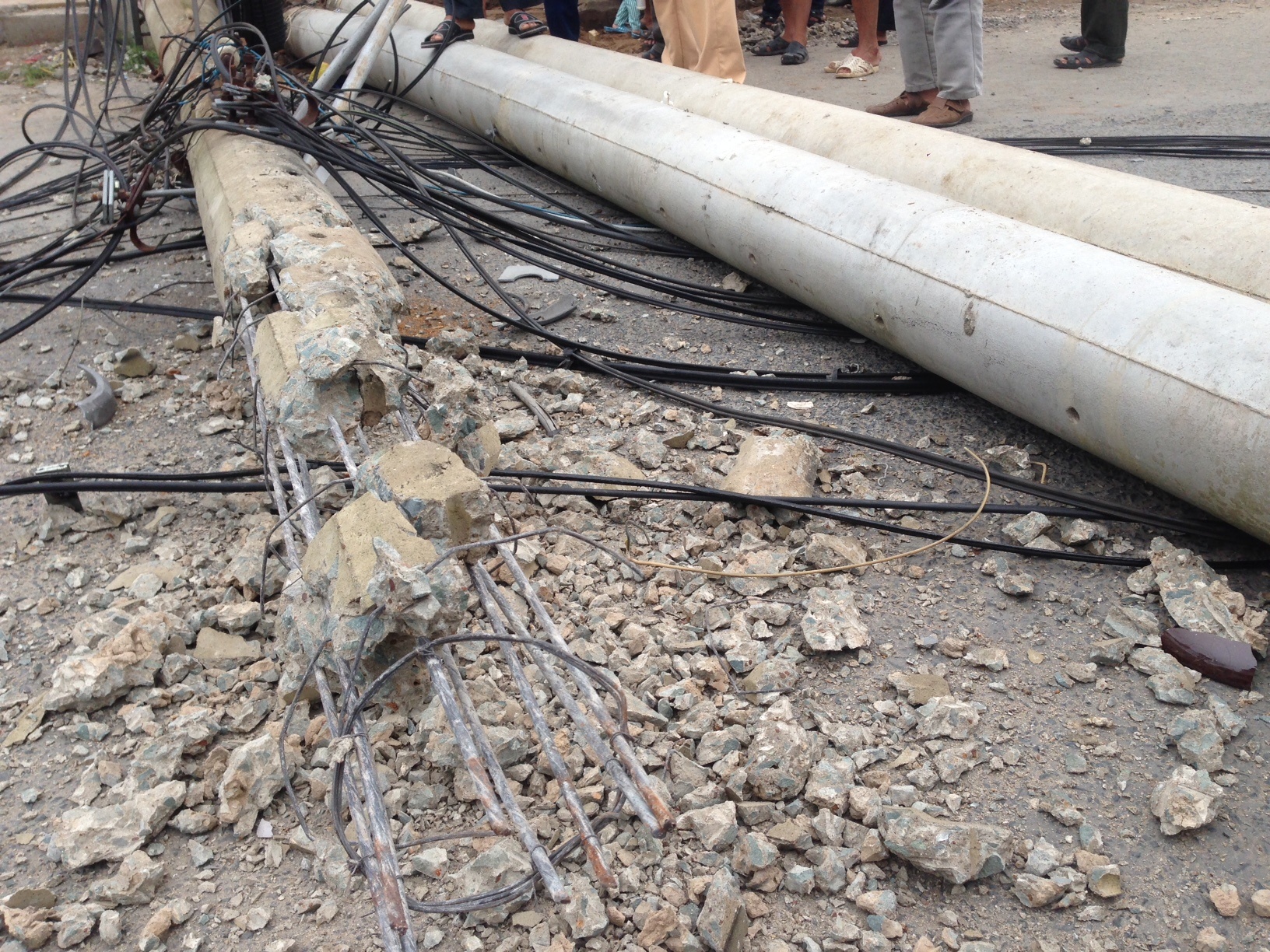 | Trụ điện này gãy ngang thân, bên trong rất ít sắt thép.