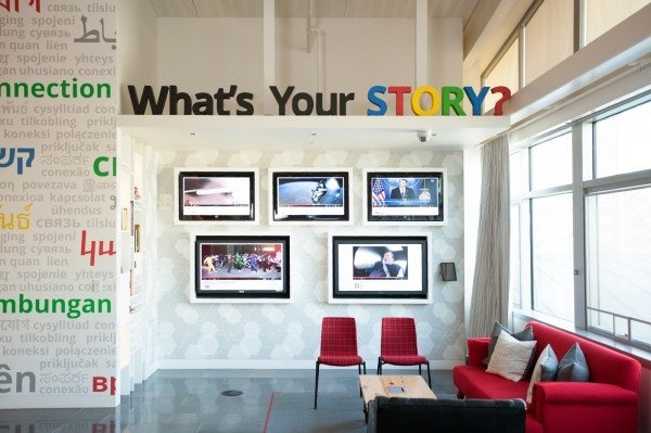 | Ánh sáng tự nhiên và không khí làm việc thoải mái luôn là ưu tiên hàng đầu tại bất cứ một cơ sở làm việc làm của Google. Phòng này bố trí cả ghế trường kỷ, sofa để nhân viên ngồi thảo luận. Phía sau là ảnh chụp màn hình của những video đã làm nên vị thế của YouTube ngày hôm nay. |