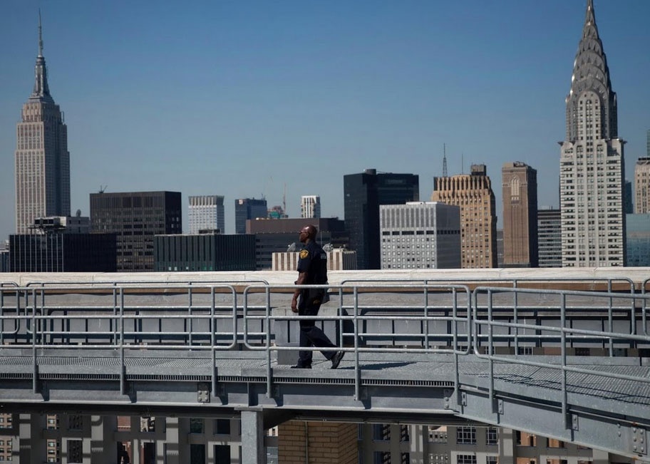 Nhân viên an ninh tuần tra trên mái công trình. |