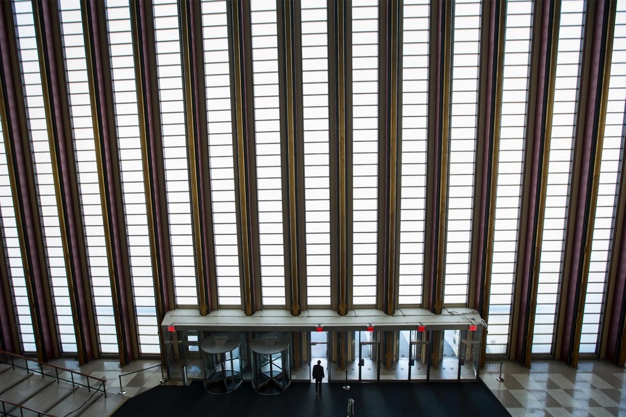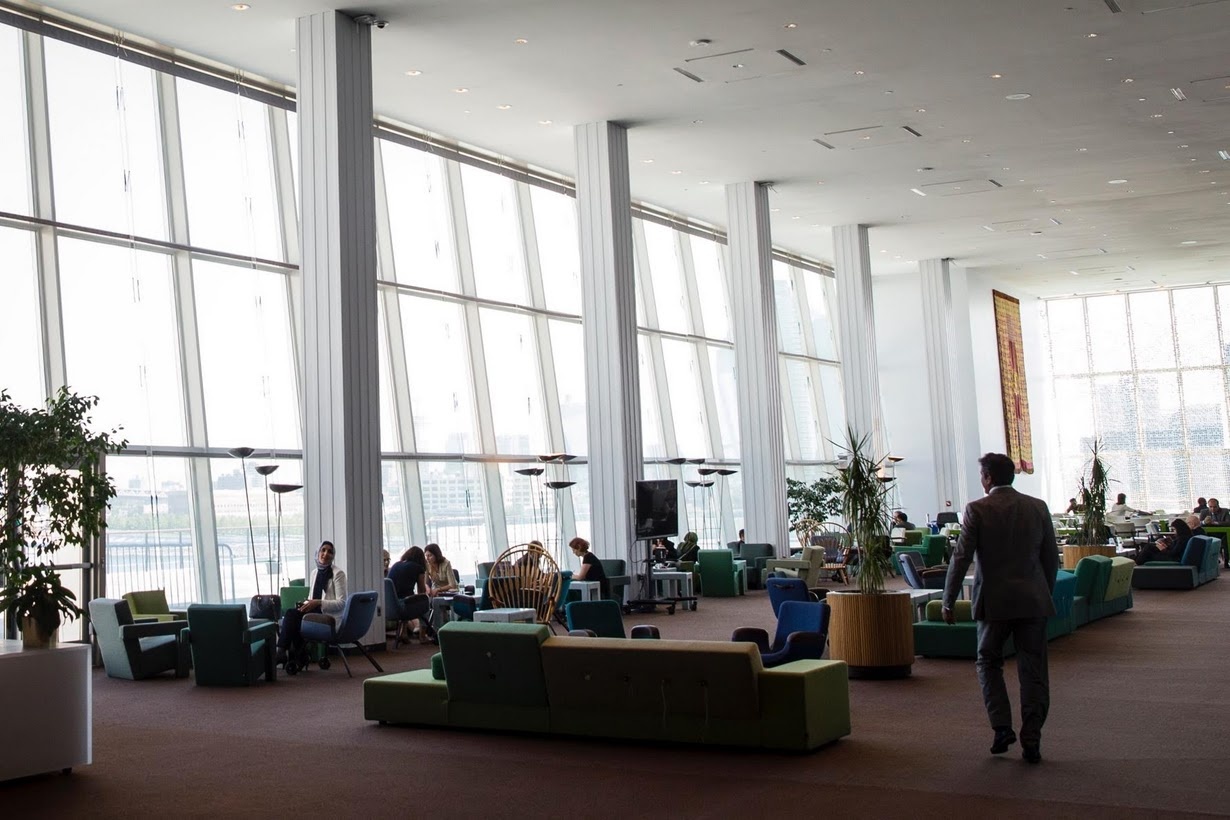 Tòa nhà giống một hẻm núi được bao quanh bởi các tác phẩm nghệ thuật. Công trình này thường hoạt động hết công suất vào mỗi kỳ họp Đại Hội đồng Liên Hợp Quốc. Những đoàn quốc tế tấp nập ra vào nơi này. |