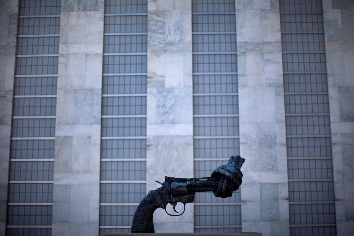 Bức tượng khẩu súng bằng đồng bị bẻ cong nòng bên ngoài công trình, tượng trưng cho sự phản đối chiến tranh và bạo lực. Trước khi xây dựng Trụ sở Liên Hợp Quốc, nơi đây là một lò mổ phục vụ thành phố New York. Thông thường, mọi người phải đi khá nhanh khi bước qua cửa dẫn vào tòa nhà. Họ hiếm khi có thời gian dừng lại để ngắm nhìn sự hùng vĩ của công trình. |