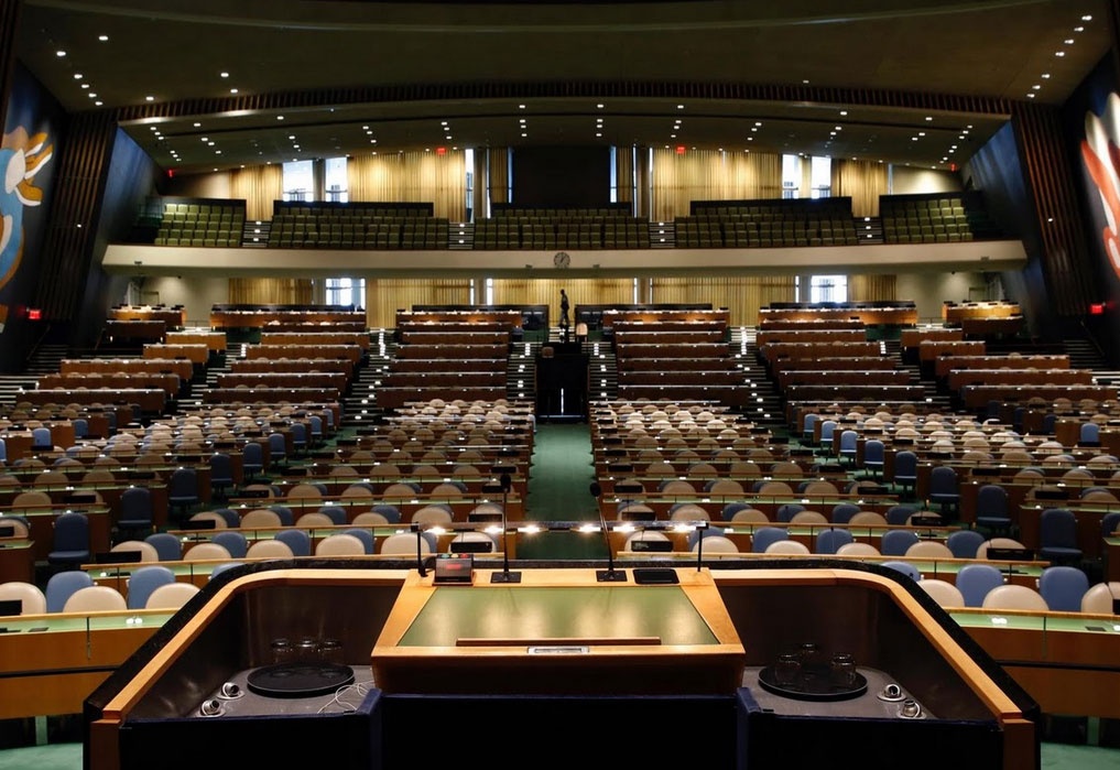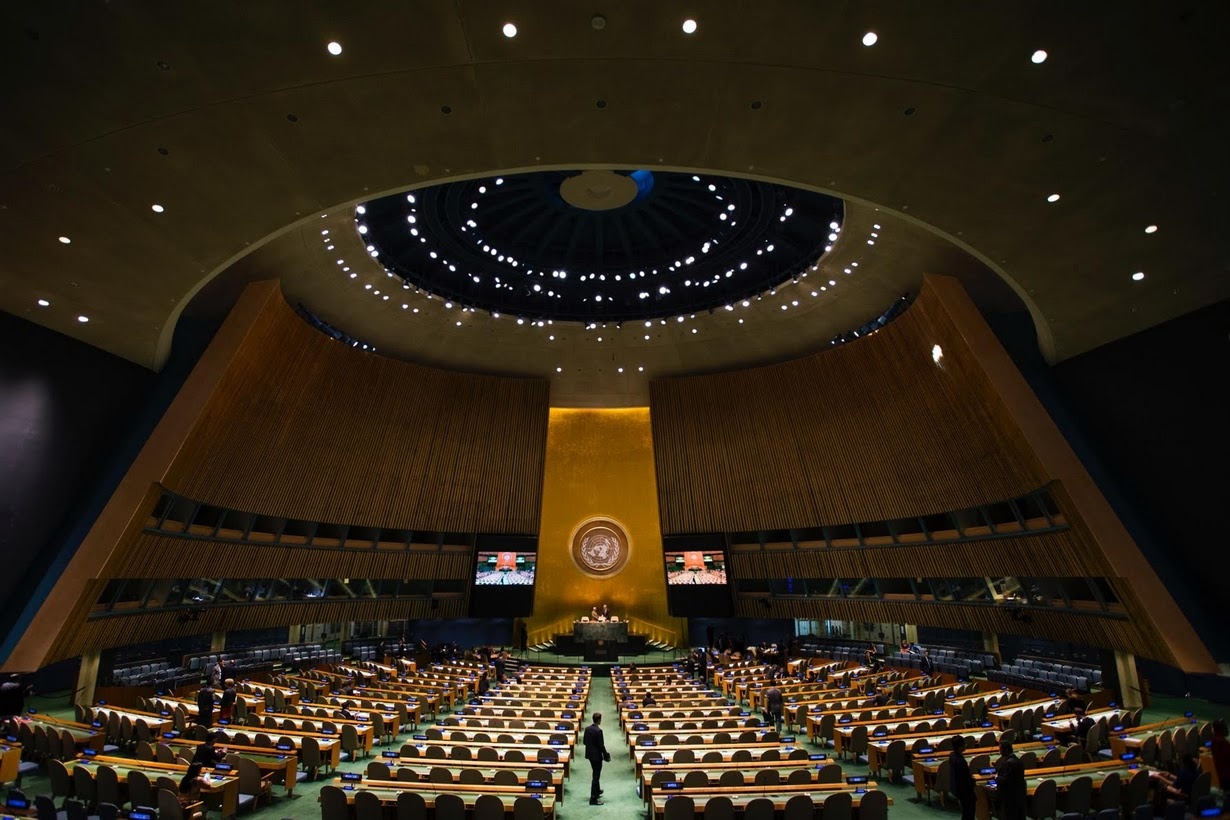 Phòng họp Đại hội đồng Liên Hợp Quốc. Giáo hoàng Francis, người đứng đầu tòa thánh Vatican và nguyên thủ các nước Việt Nam, Trung Quốc, Nga, Mỹ, Nhật Bản, Cuba... có phát biểu tại căn phòng này trong kỳ hội nghị vạch ra tương lai 15 năm tới cho toàn cầu. |