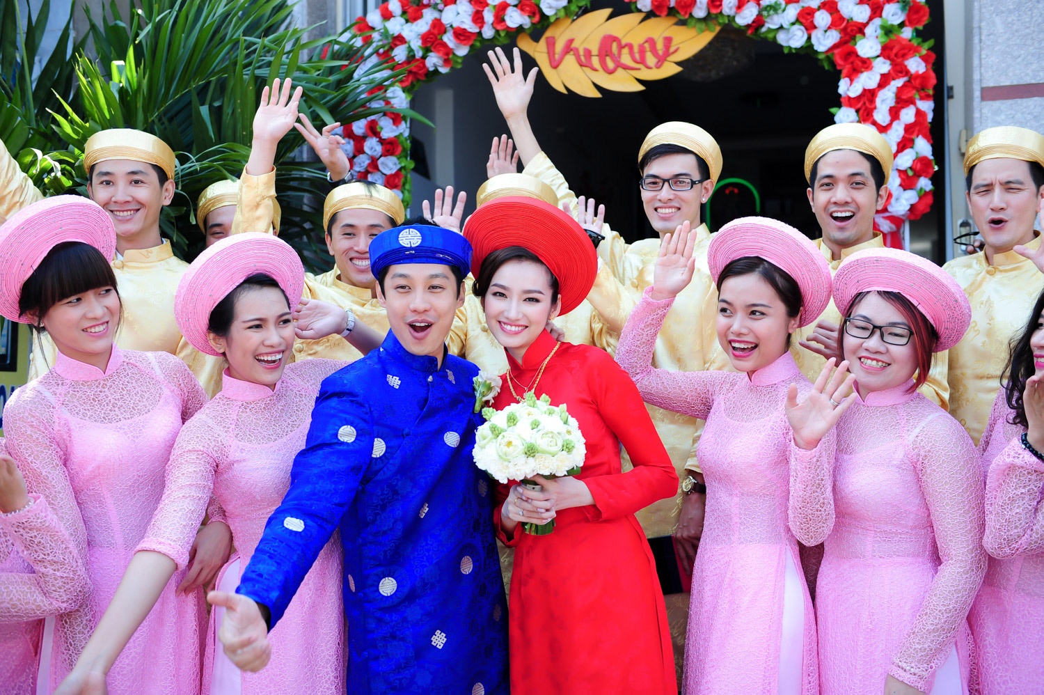 | Cặp đôi chụp hình vui vẻ cùng bạn bè, người thân trước khi ra xe về TP HCM để chuẩn bị cho hôn lễ sang trọng, hoành tráng tối nay. |