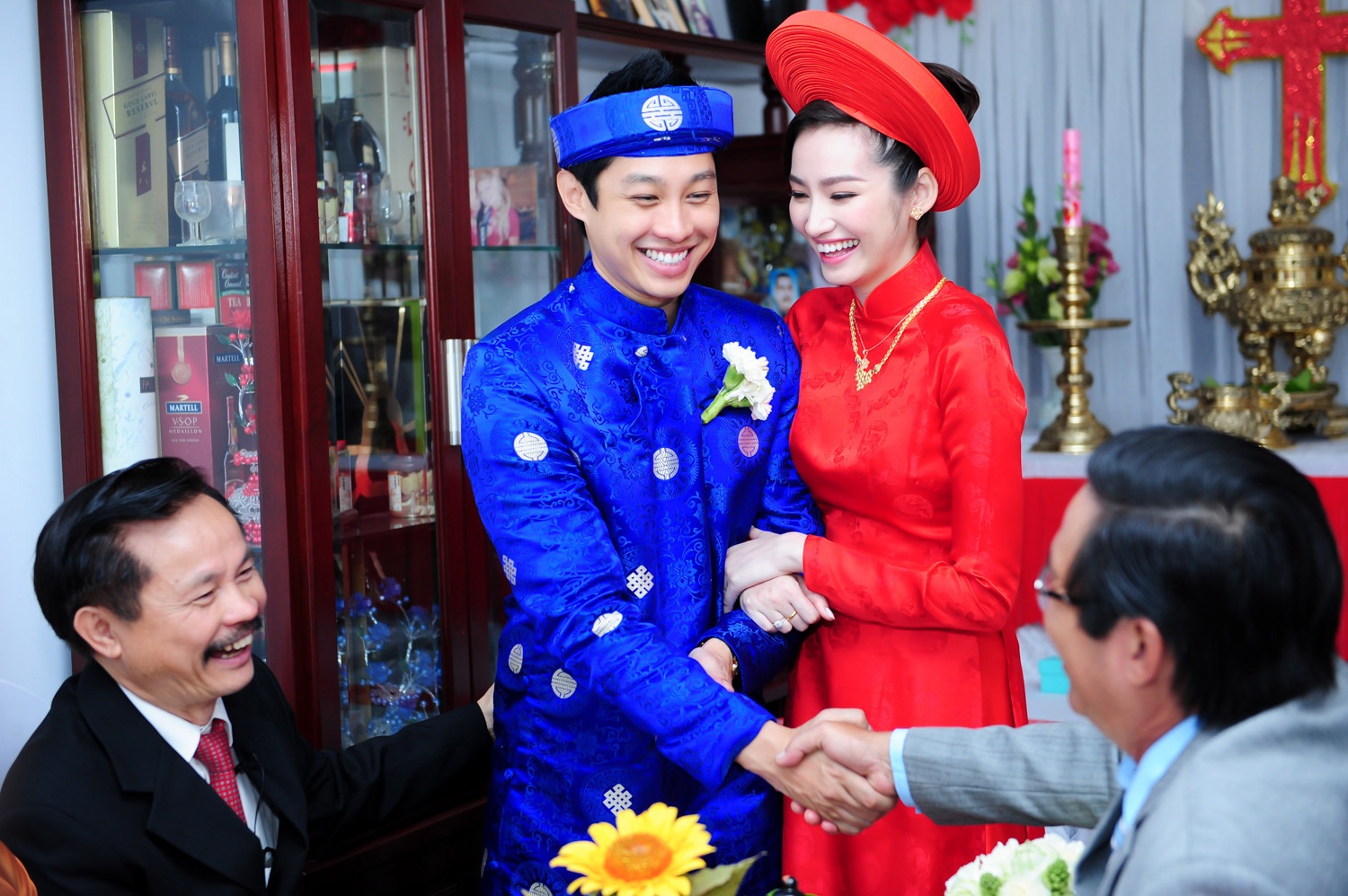 | Cả hai không giấu được niềm hạnh phúc qua nụ cười, ánh mắt. Lễ rước dâu diễn ra trong không khí ấm cúng, vui vẻ, chỉ có người thân trong gia đình. |