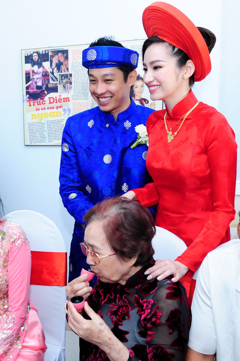 Sáng 7/2, lễ xin dâu của hoa hậu Trúc Diễm diễn ra tại nhà riêng ở huyện Hóc Môn, TP HCM trong không khí giản dị, ấm cúng. Cô dâu chú rể không giấu được niềm hạnh phúc viên mãn trên gương mặt.