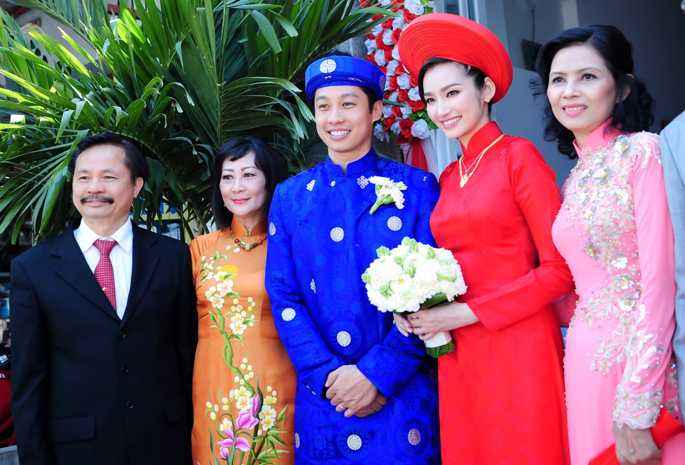 | Cô dâu chú rể chụp hình kỷ niệm cùng bố mẹ hai bên. Sau đám cưới, Trúc Diễm sẽ hạn chế công việc để đảm bảo thiên chức làm vợ, làm mẹ. |