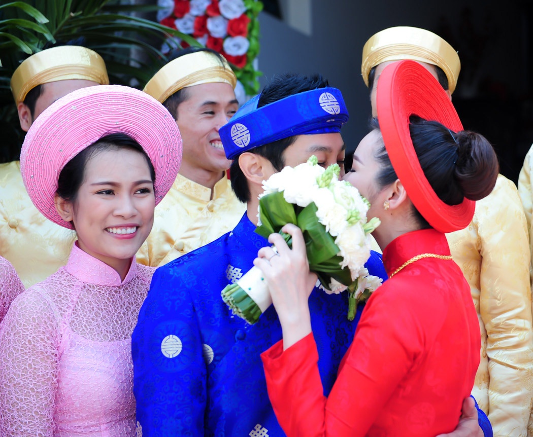 Cặp tân nương, tân lang khóa môi thể hiện tình cảm trước sự chứng kiến của bạn bè, gia đình hai bên trong lễ rước dâu sáng 7/2.