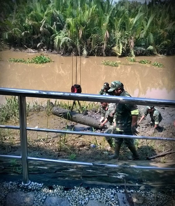Theo thông tin từ ban chỉ huy quân sự phường Trường Thạnh, khoảng 9h ngày 25/8, lực lượng công binh TP.HCM phối hợp cùng ban chỉ huy quân sự quận 9 tiến hành trục vớt quả bom dưới kênh Môn.