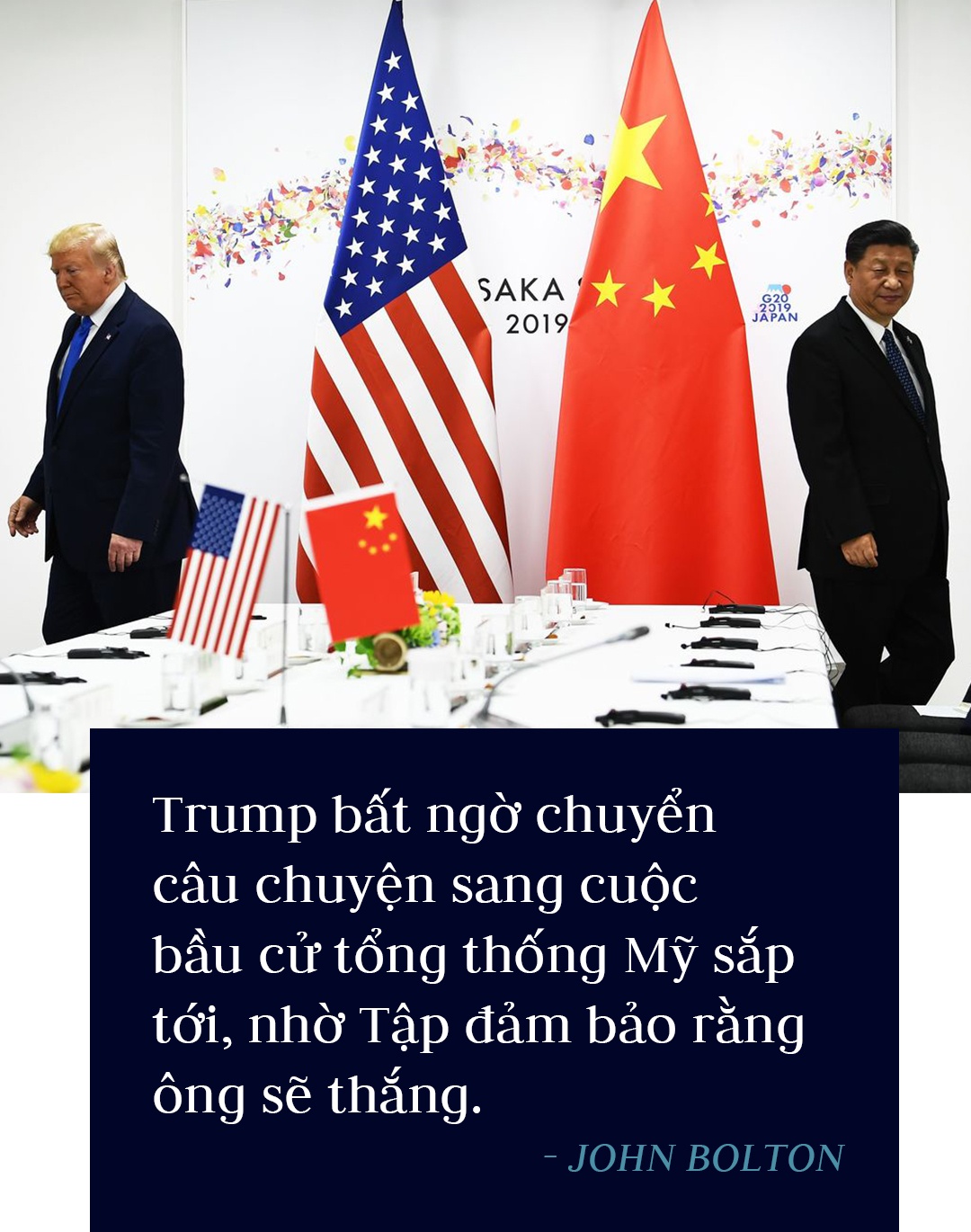 "Sau đó, một cách bất ngờ, Trump chuyển sang nói về cuộc bầu cử tổng thống Mỹ sắp tới, ám chỉ năng lực kinh tế của Trung Quốc và nhờ ông Tập đảm bảo ông sẽ giành chiến thắng. Ông nhấn mạnh tầm quan trọng của nông dân và việc Trung Quốc mua đậu nành và lúa mì nhiều hơn đối với kết quả bầu cử", ông Bolton viết trong sách, theo Wall Street Journal.