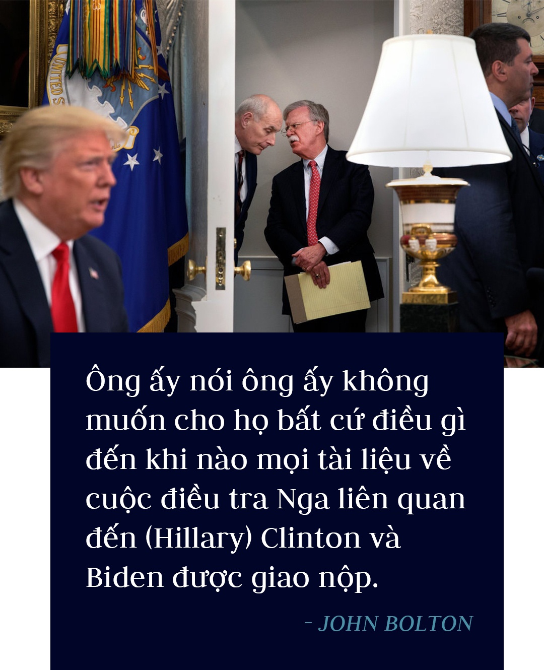 Cuộc họp quan trọng diễn ra vào ngày 20/8, theo ông Bolton, khi ông Trump "nói rằng ông không ủng hộ việc gửi cho họ bất cứ thứ gì đến khi nào mọi tài liệu về cuộc điều tra Nga liên quan đến (Hillary) Clinton và ông Biden đã được giao nộp".