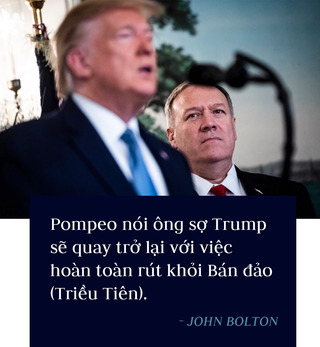 Ông Pompeo thường được miêu tả là cố gắng ngăn ông Trump rút quân ra khỏi nhiều quốc gia khác nhau, kể cả ở Trung Đông và bán đảo Triều Tiên. "Pompeo sợ Trump quay trở lại với việc rút quân khỏi bán đảo hoàn toàn", ông Bolton viết về cuộc thảo luận sau hội nghị thượng đỉnh Trump - Kim.