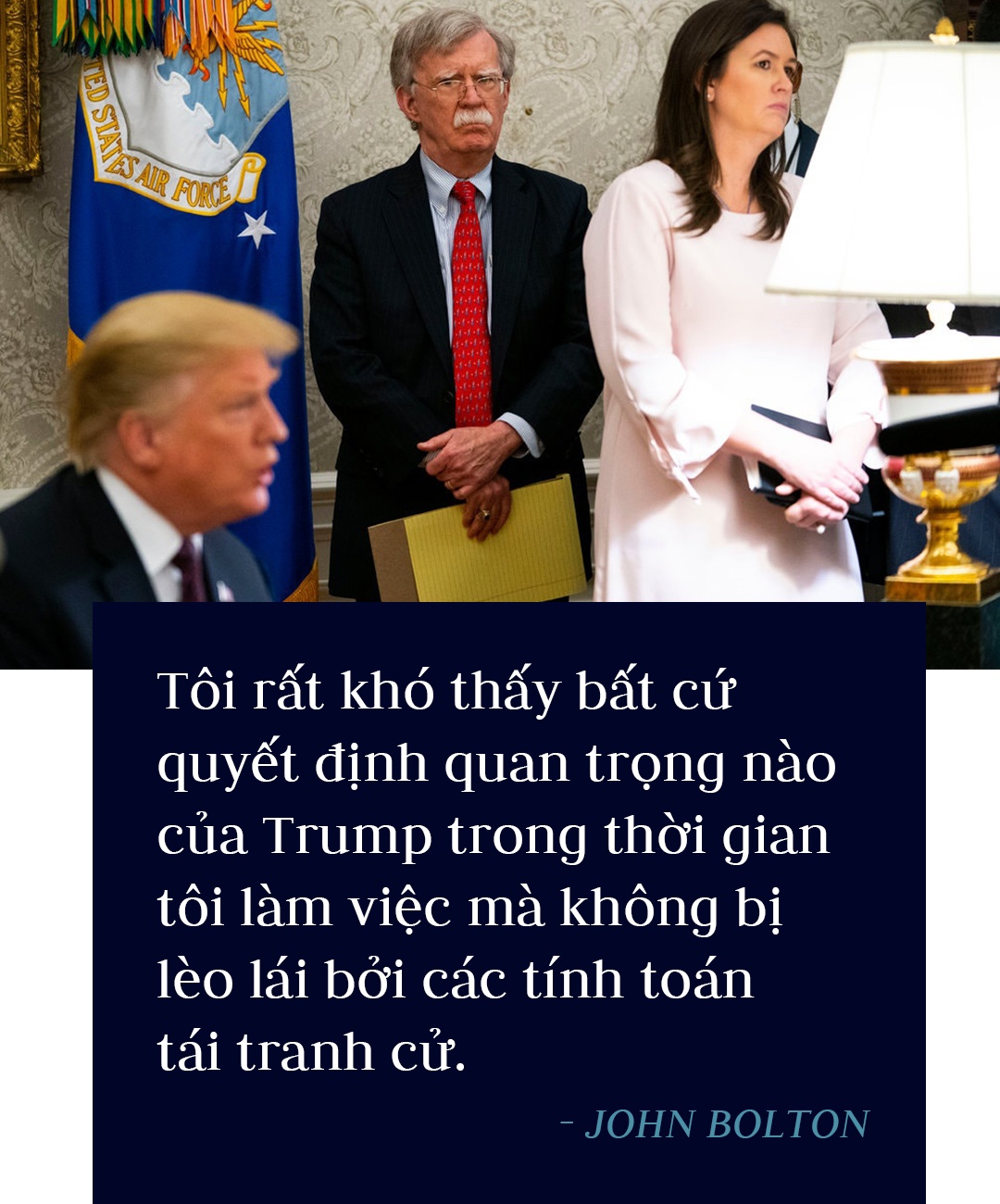 "Trump trộn lẫn chuyện cá nhân và chuyện quốc gia không chỉ trong các vấn đề thương mại mà trong toàn bộ lĩnh vực an ninh quốc gia. Tôi rất khó để chỉ ra bất kỳ quyết định quan trọng nào của Trump trong thời gian tôi ở Nhà Trắng mà không được điều khiển bởi các tính toán để có thể tái đắc cử", ông Bolton viết.