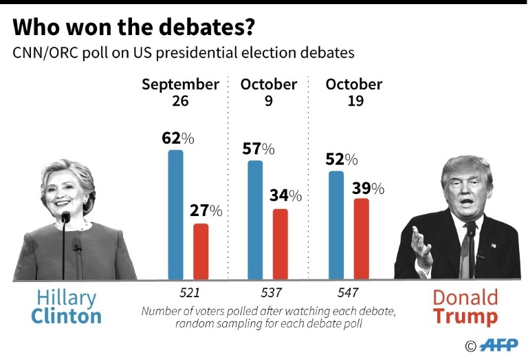 | Khảo sát của CNN/ORC sau các lần tranh luận ngày 26/9, 9/10 và 19/10 giữa hai ứng viên tổng thống cho thấy đa số người theo dõi tranh luận đánh giá bà Clinton giành chiến thắng trong các cuộc "đấu khẩu". Đồ họa: AFP |