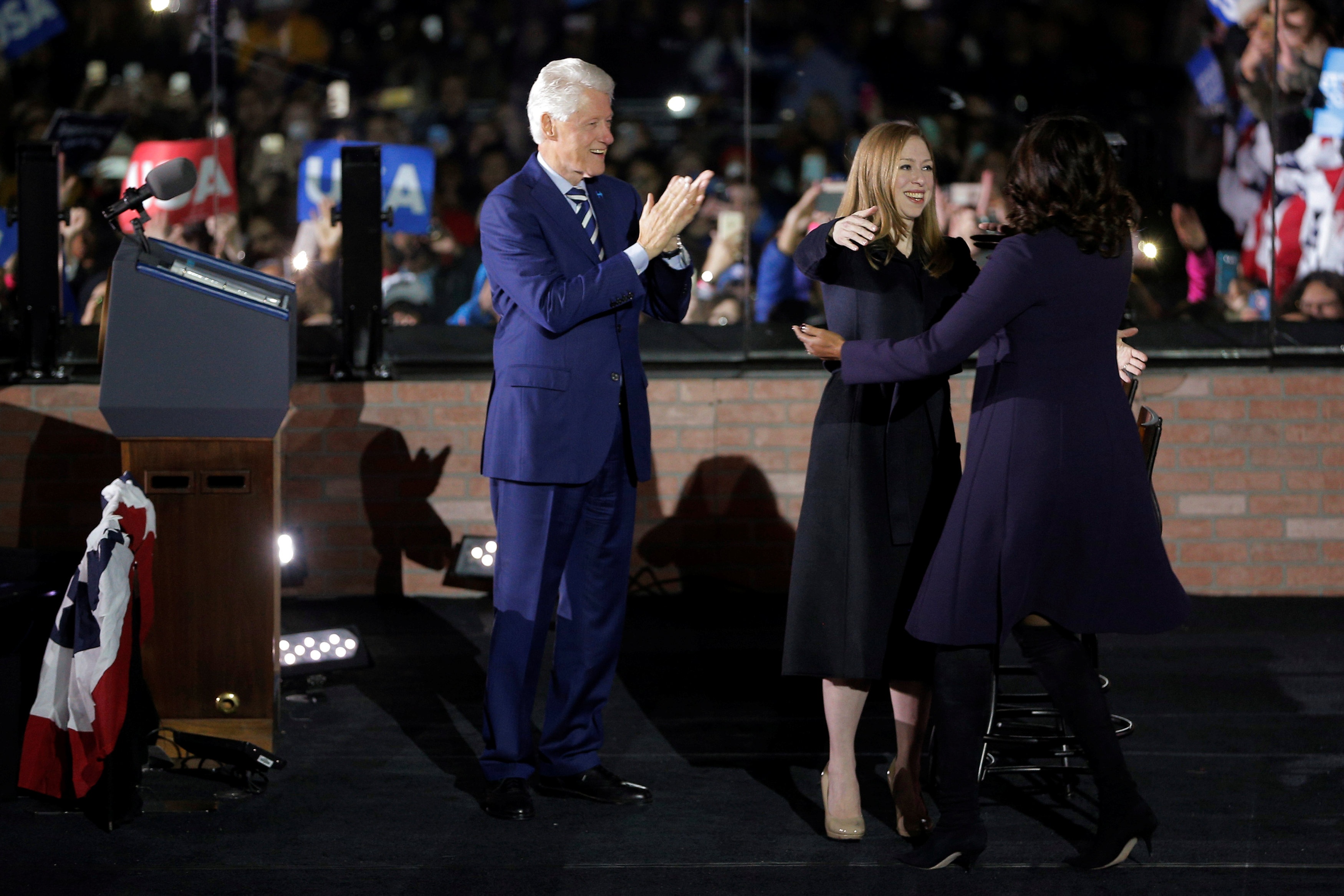 Cựu tổng thống Mỹ Bill Clinton, con gái Chelsea và Đệ nhất phu nhân Mỹ hiện tại Michelle Obama cũng tham gia vận động tranh cử cho bà Hillary Clinton ở Pennsylvania hôm 7/11. Trong những giờ phút cuối cùng này, Clinton đã đem đến Pennsylvania một đội hình hùng hậu gồm ông chồng cựu tổng thống, con gái và vợ chồng Tổng thống Barack Obama. Ảnh: Reuters.