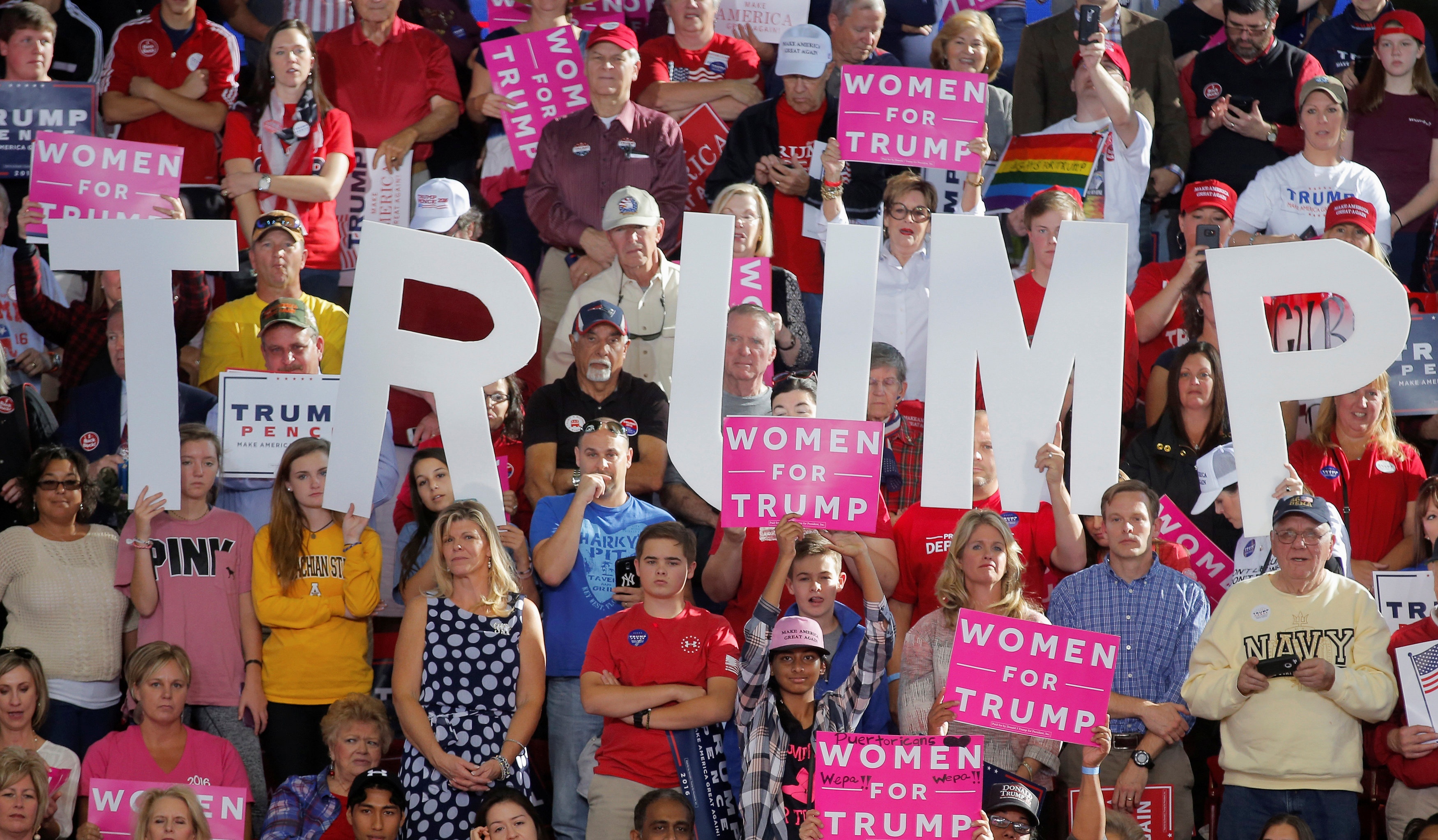 Nhóm cử tri chủ yếu của Trump vẫn là những người Mỹ da trắng đang cảm thấy vai trò của mình bị thu hẹp vì sự xuất hiện của người di cư. Ngoài ra, mặc cho rất nhiều vụ bê bối khi sử dụng lời lẽ thô tục với phụ nữ, Trump vẫn có một lượng cử tri nữ đông đảo. Ảnh: Reuters.