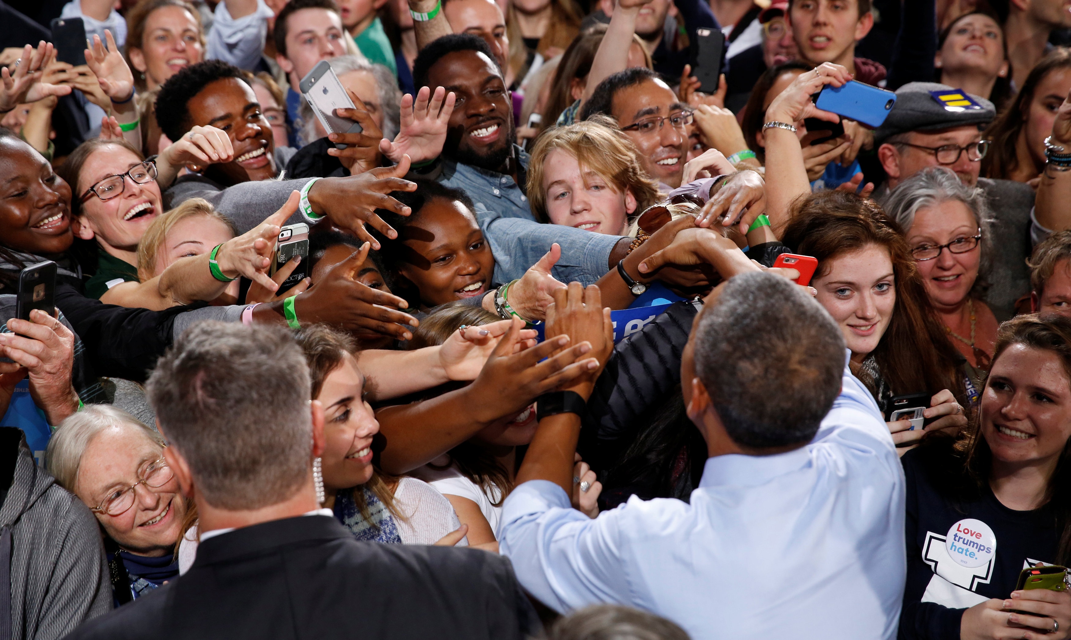Tổng thống Obama trong vòng vây của người hâm mộ khi ông vận động tranh cử giúp Clinton tại bang New Hampshire. Ảnh: Reuters.
