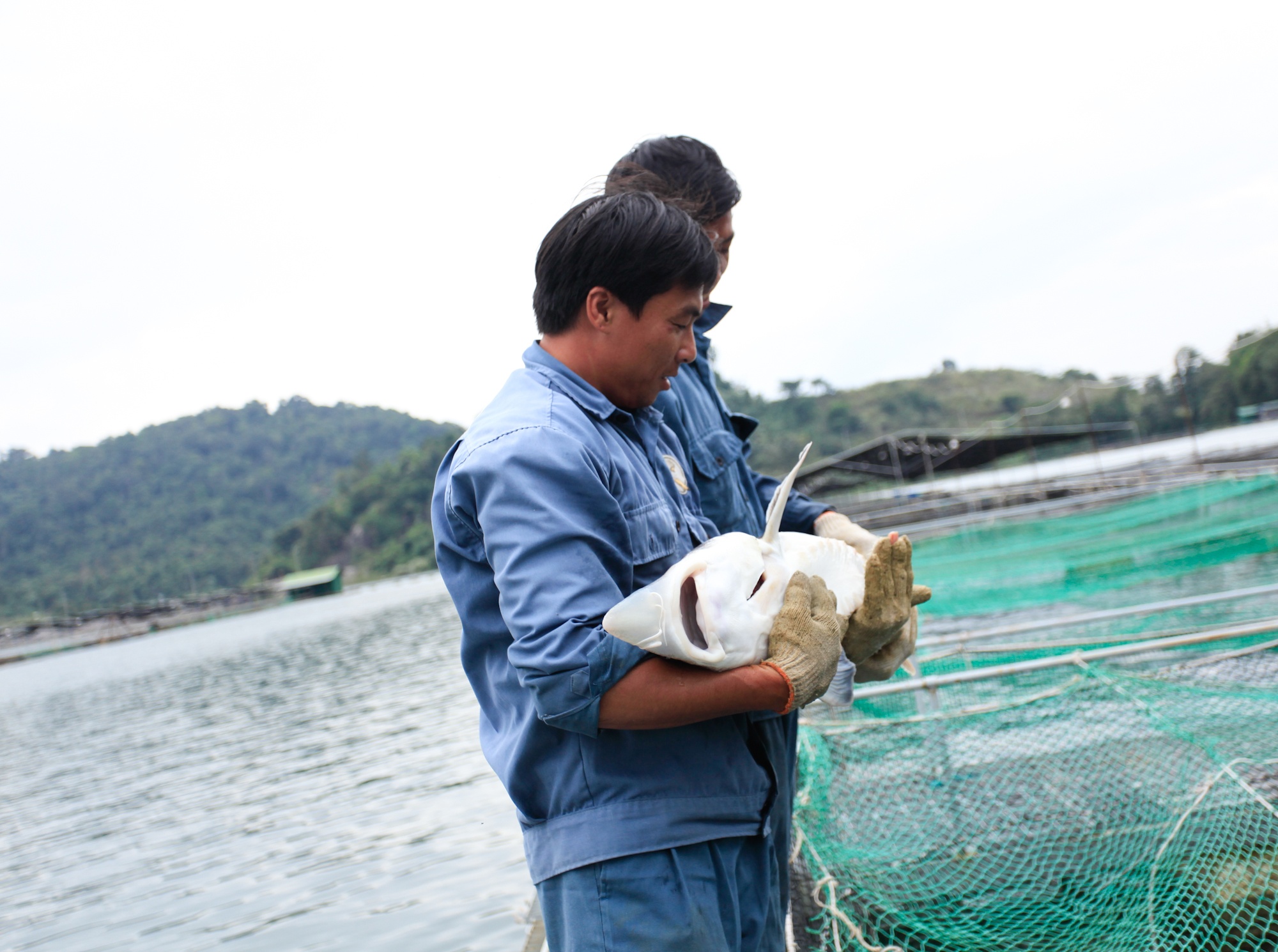 | Khi đủ tuổi, cá cái sẽ được đưa khỏi vùng nuôi để siêu âm, chuẩn bị cho quá trình lấy trứng. |