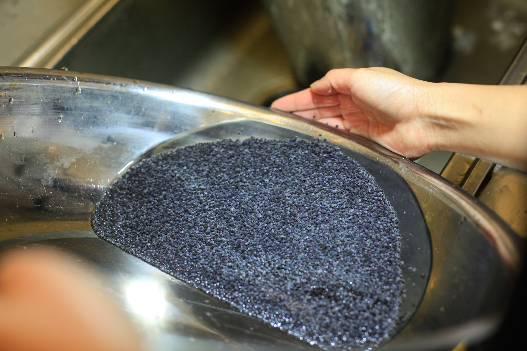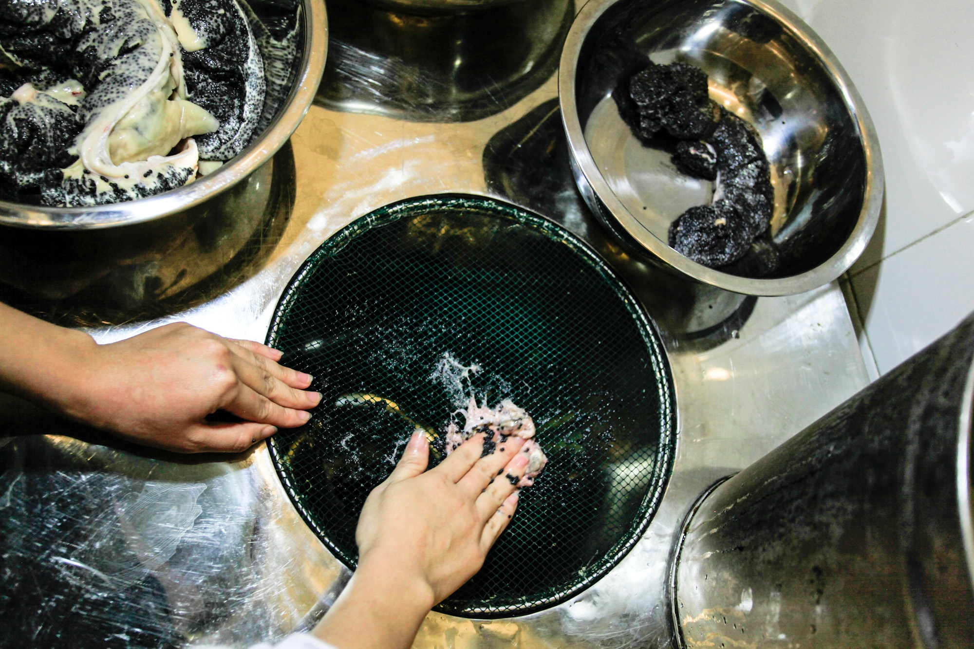 | Phần nang trứng được cuộn lại trên một tấm lưới. Kỹ thuật viên sẽ lấy tay chà xát nhẹ để trứng cá rơi xuống chiếc chậu phía dưới. |