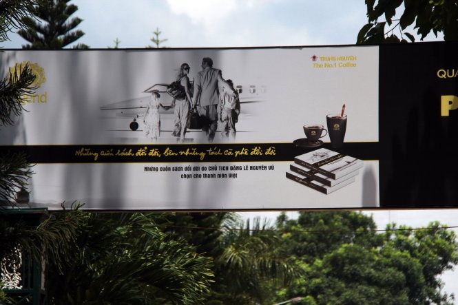 | Bảng hiệu cà phê Trung Nguyên trước đó có dòng chữ “Những cuốn sách đổi đời do chủ tịch Đặng Lê Nguyên Vũ chọn cho thanh niên Việt". |