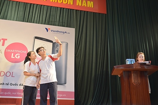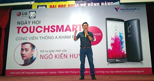 Trong chương trình khởi động tại ĐH Nguyễn Tất Thành (TP.HCM), Trung Quân giao lưu và giúp các bạn sinh viên trải nghiệm những dòng smartphone mới nhất từ LG và Viễn Thông A.