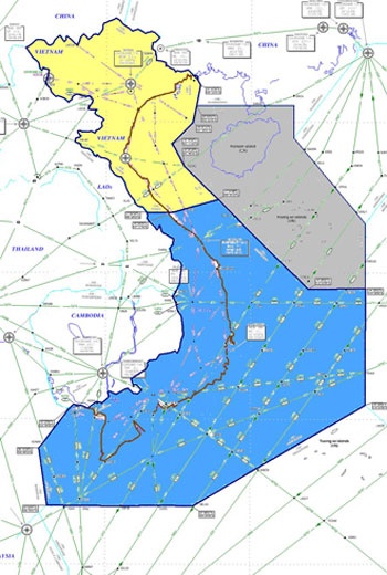 FIR Hồ Chí Minh (màu xanh) tiếp giáp với FIR Sanya của Trung Quốc và FIR của Singapore. Nguồn: Cục hàng không Việt Nam. |