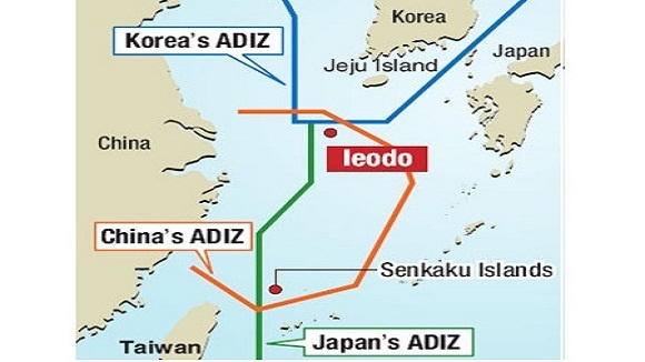 | Vùng nhận dạng phòng không mới do Trung Quốc tuyên bố trùm lên bãi đá chìm Ieodo do Hàn Quốc kiểm soát. Ảnh: VTV |