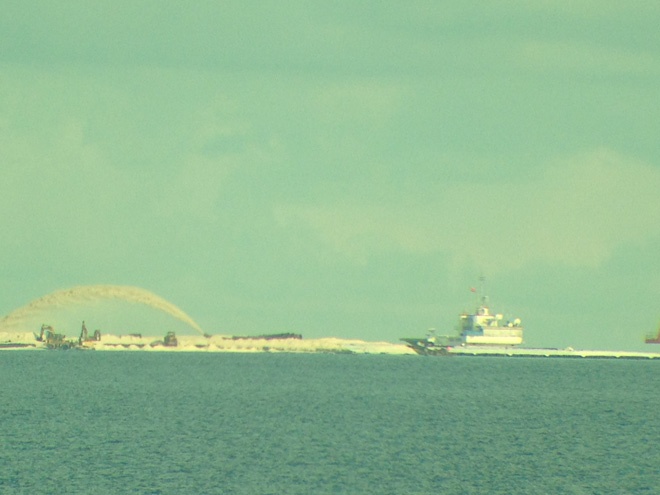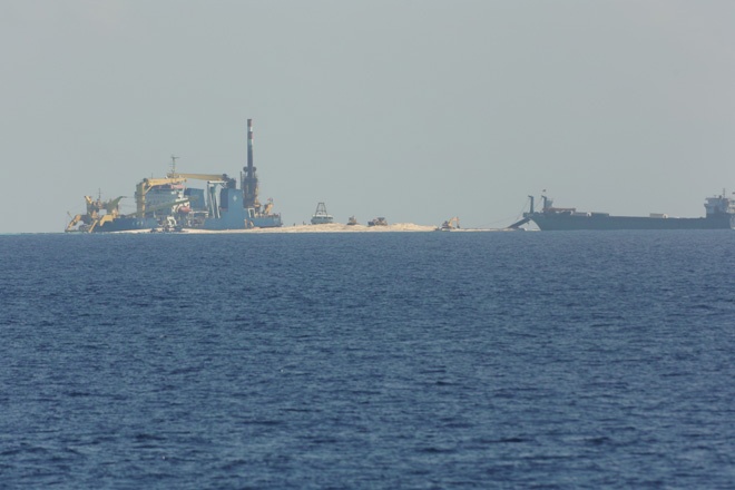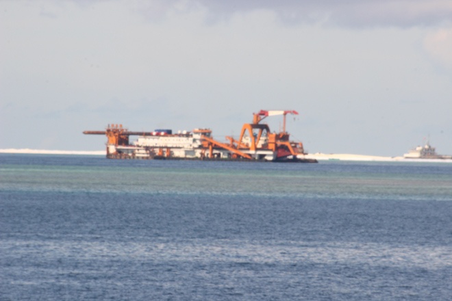 Ghi nhận của phóng viên tại hiện trường cho thấy Trung Quốc đã điều tàu vận tải công suất lớn, tàu cuốc Thiên Kình mở luồng, hút phun cát, cấp tập xây dựng trên bãi đá Tư Nghĩa thuộc quần đảo Trường Sa của Việt Nam. Theo các chuyên gia pháp luật quốc tế, hành động trên là bằng cứ sống động thể hiện rõ âm mưu độc chiếm Biển Đông.
