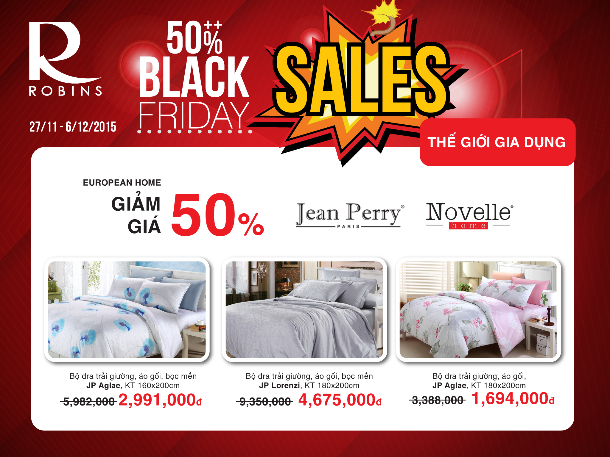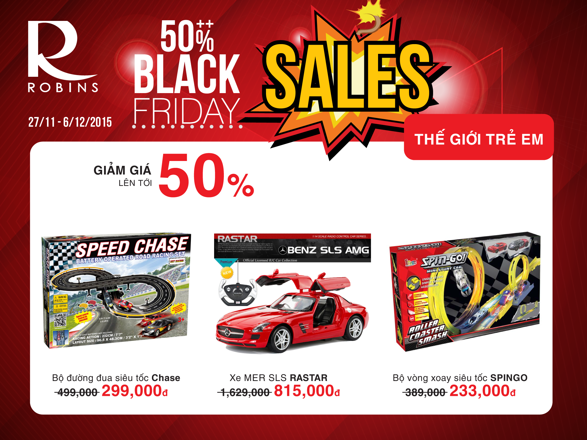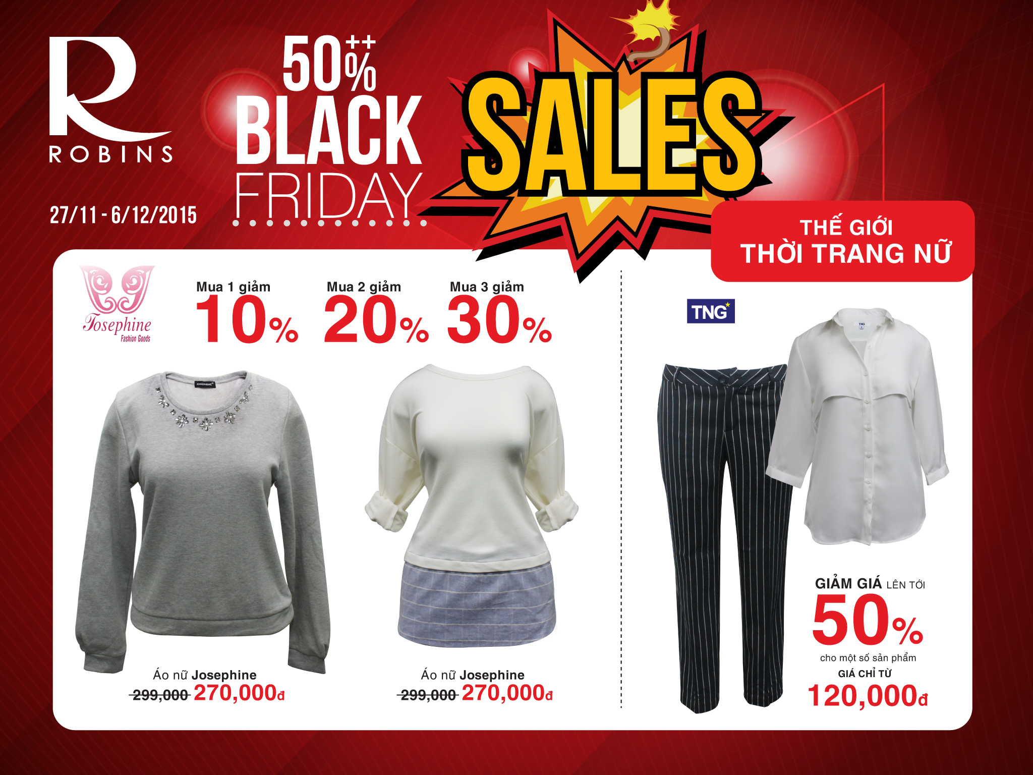 Không đứng ngoài xu hướng toàn cầu, TTMS Robins cũng tưng bừng thực hiện chương trình siêu khuyến mãi Black Friday từ 27/12 đến 6/12. Trong thời gian Black Friday, bạn sẽ tìm thấy tại Robins hàng nghìn sản phẩm mỹ phẩm, thời trang nam, nữ và trẻ em, giày dép, túi xách, phụ kiện, hàng gia dụng, đồ chơi trẻ em giảm giá lên đến hơn 50%, một số sản phẩm giá sốc, nhận quà tặng khi mua sắm.