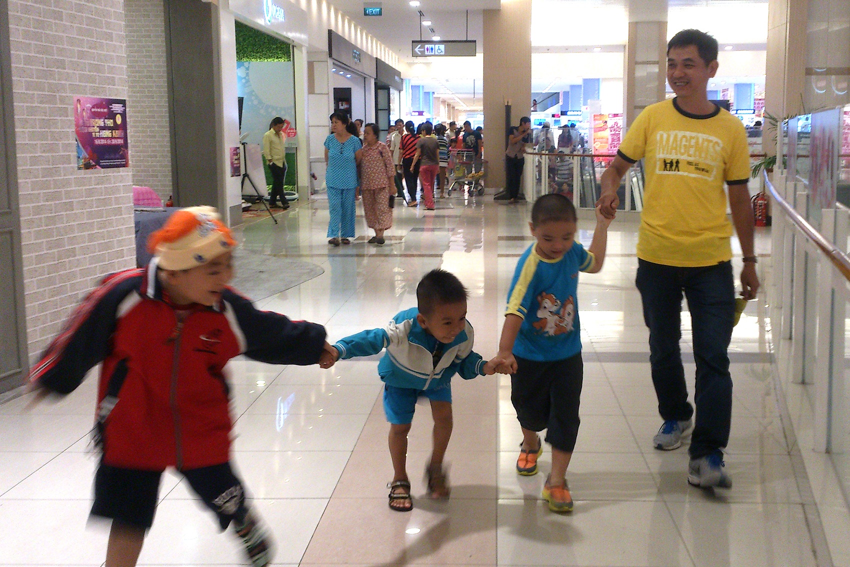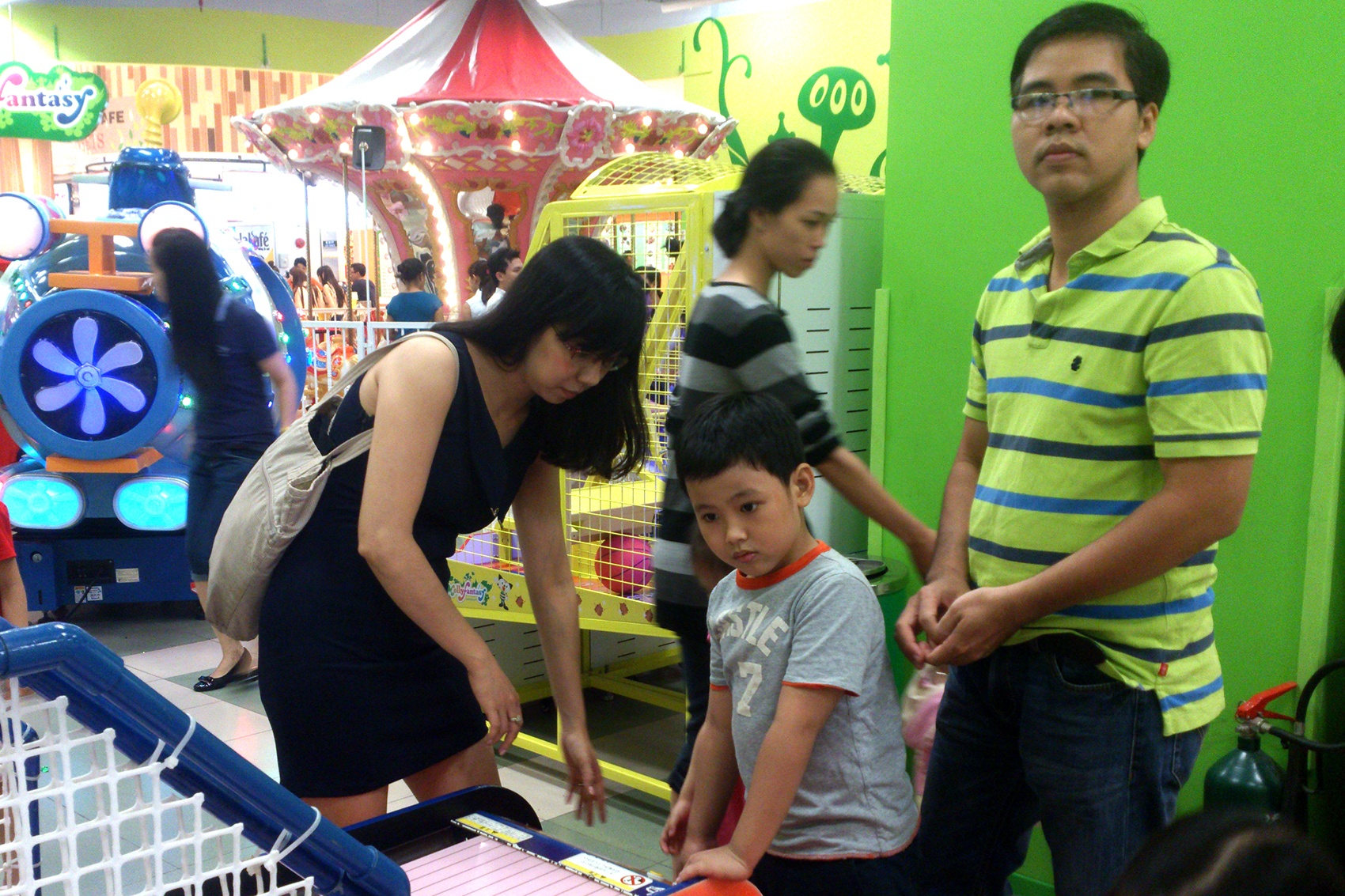 Không đi chơi xa, nhiều gia đình chọn các siêu thị, trung tâm thương mại có khu trò chơi cho trẻ để đưa con đến vui chơi.