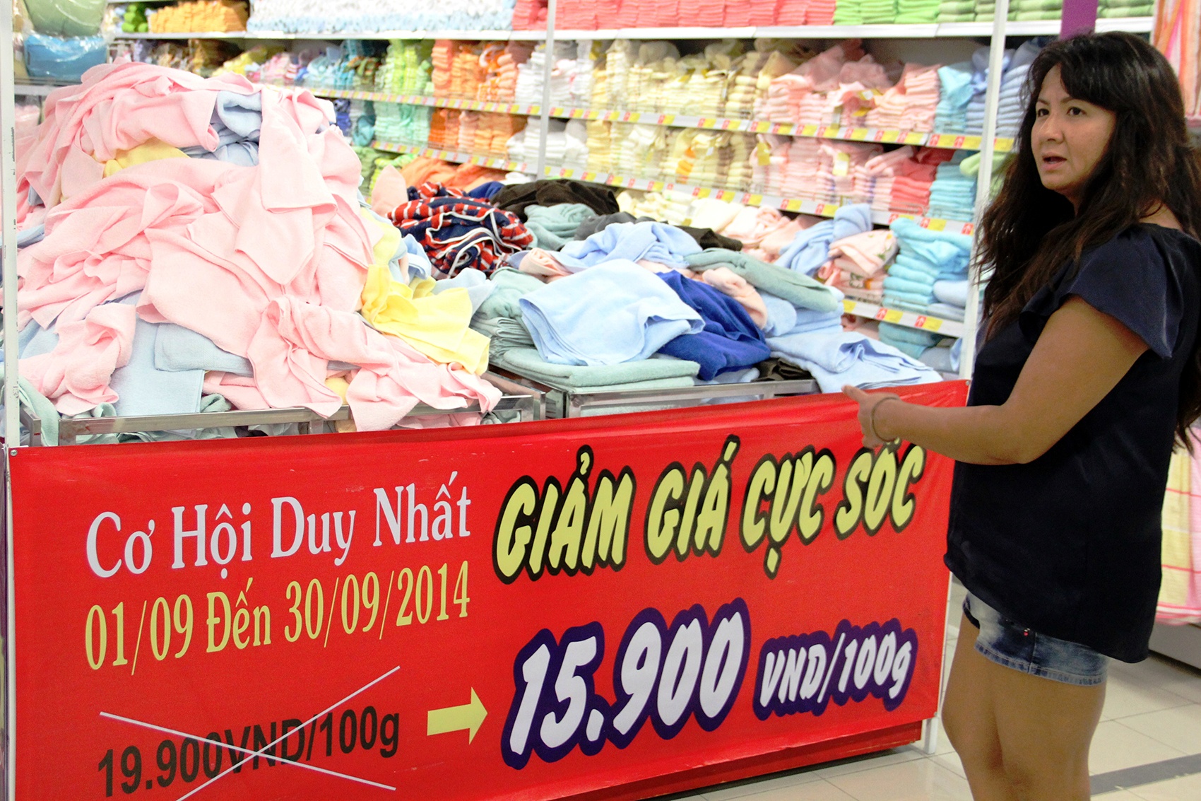 | Để kích cầu mua sắm, các trung tâm thương mại, siêu thị đều tổ chức khuyến mãi lớn, nhiều mặt hàng treo bảng giảm giá 20 - 40%, song không hút khách mua. |
