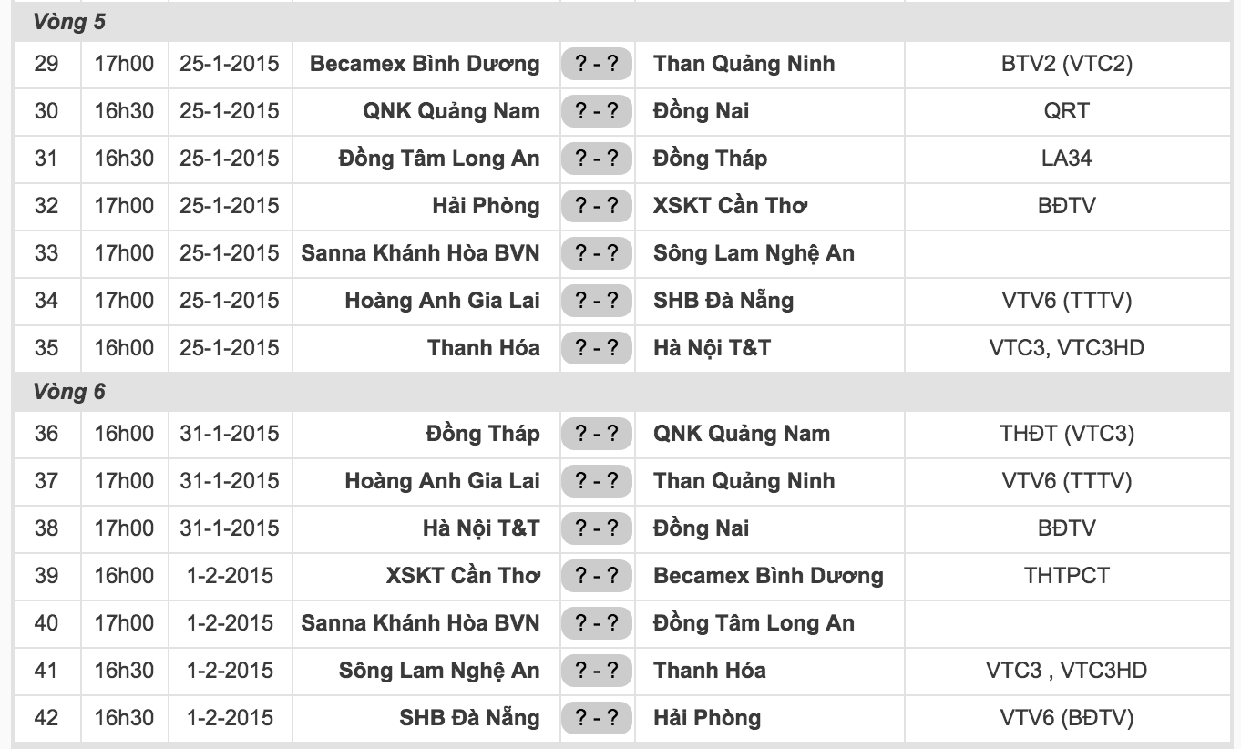 | Lịch thi đấu vừa truyền hình trực tiếp vòng 5, vòng 6 V.League 2015. |