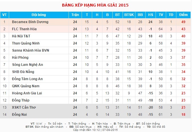 | Bảng xếp hạng tính đến hết vòng 24 V.League 2015. Ảnh: VPF |