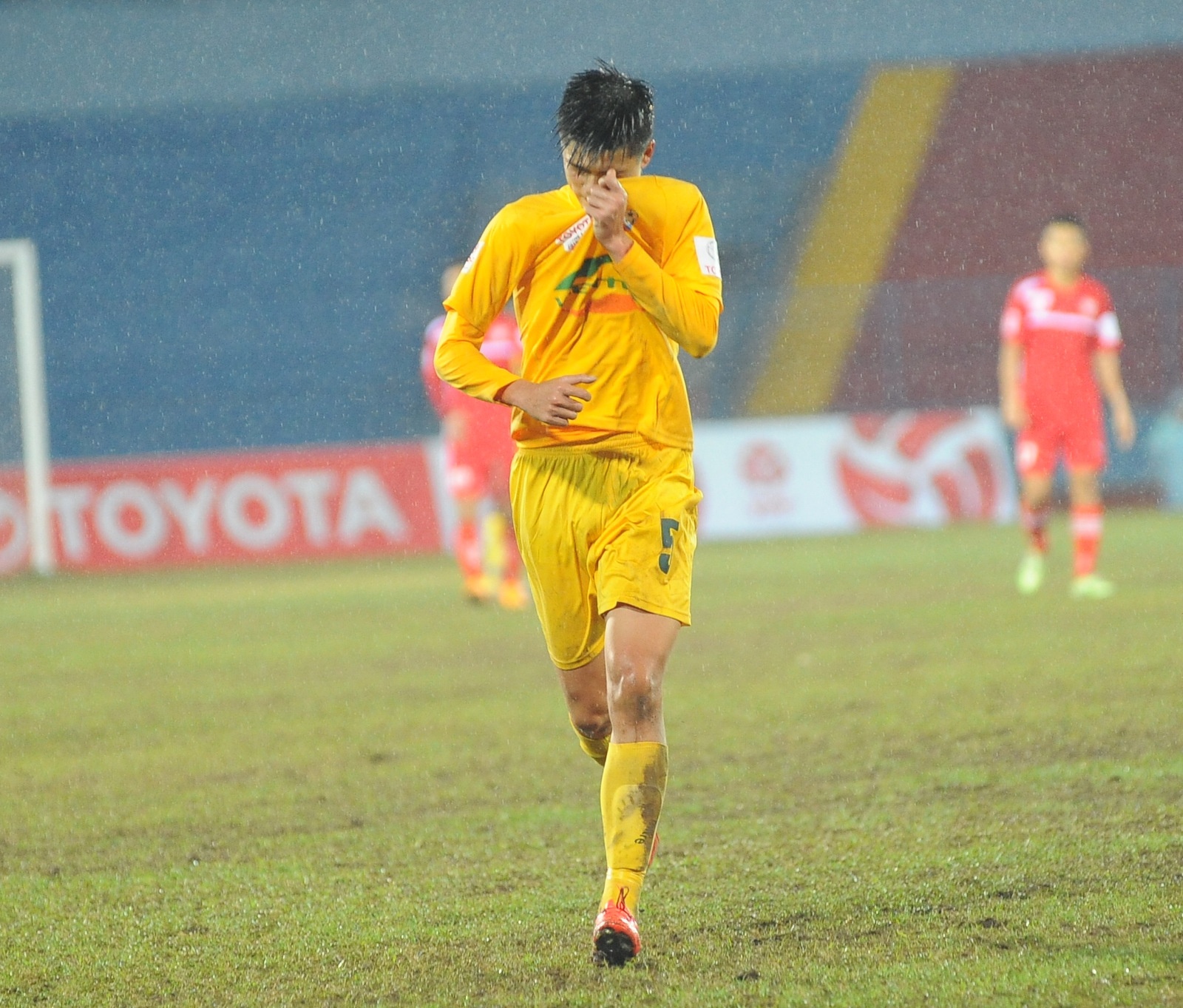 | HLV Vũ Quang Bảo đội mưa chỉ đạo các cầu thủ Thanh Hoá suốt 90 phút của trận đấu. |
