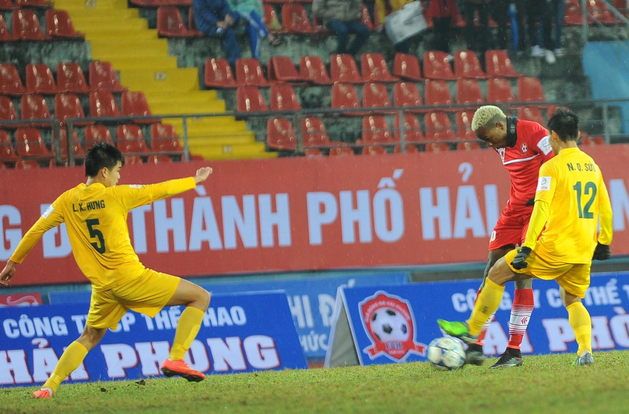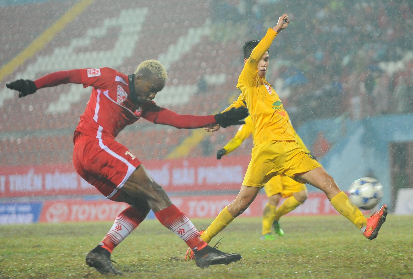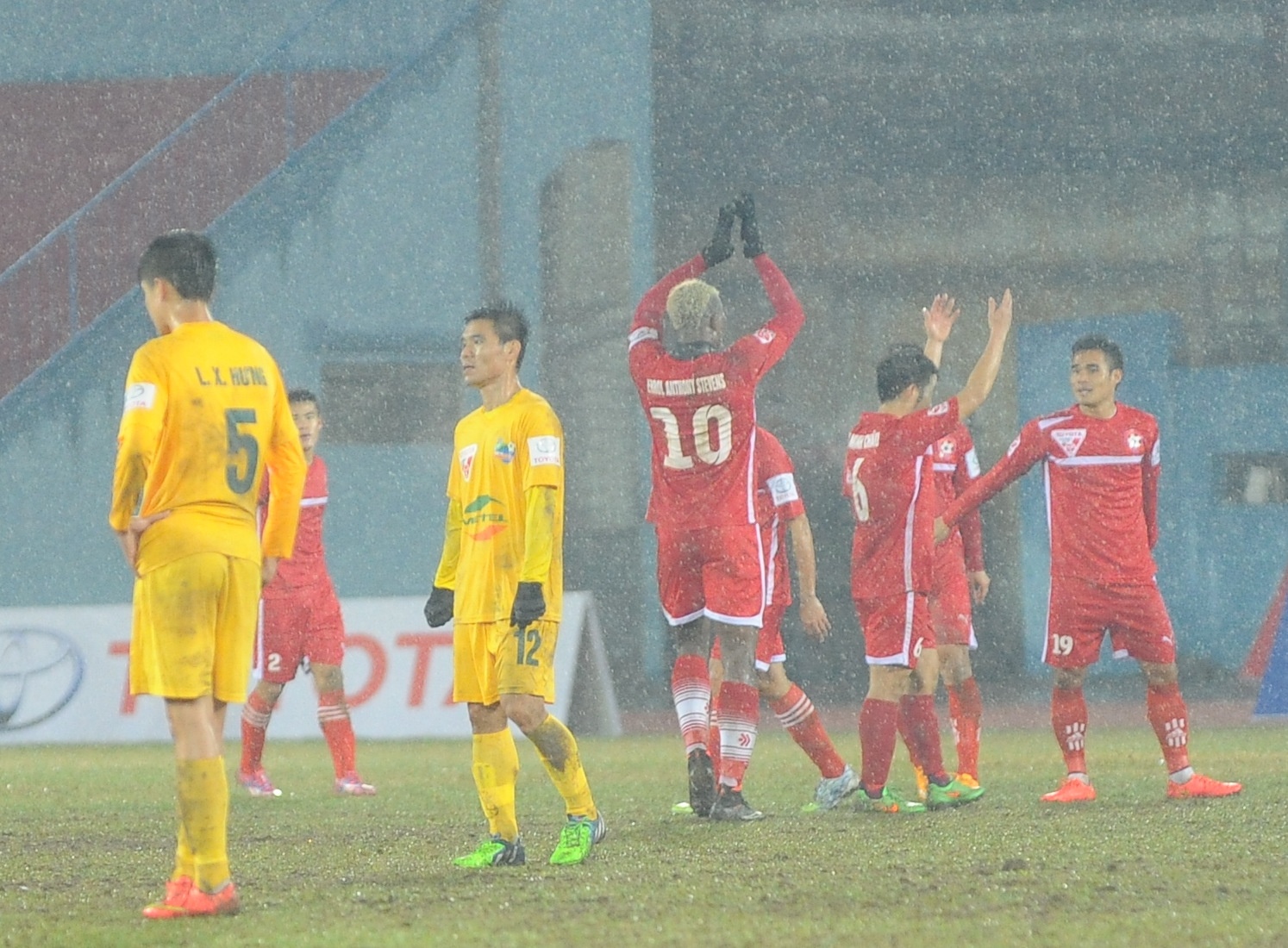 | Ngay ở phút 14 của trận đấu, tiền đạo Stevens (gốc Jamaica) đã reo sầu lên hàng thủ Thanh Hoá khi có pha che chắn bóng khéo léo trước khi tung ra cú sút tinh tế vượt qua sự truy cản của trung vệ Lục Xuân Hưng mở tỷ số cho đội chủ nhà Hải Phòng. |