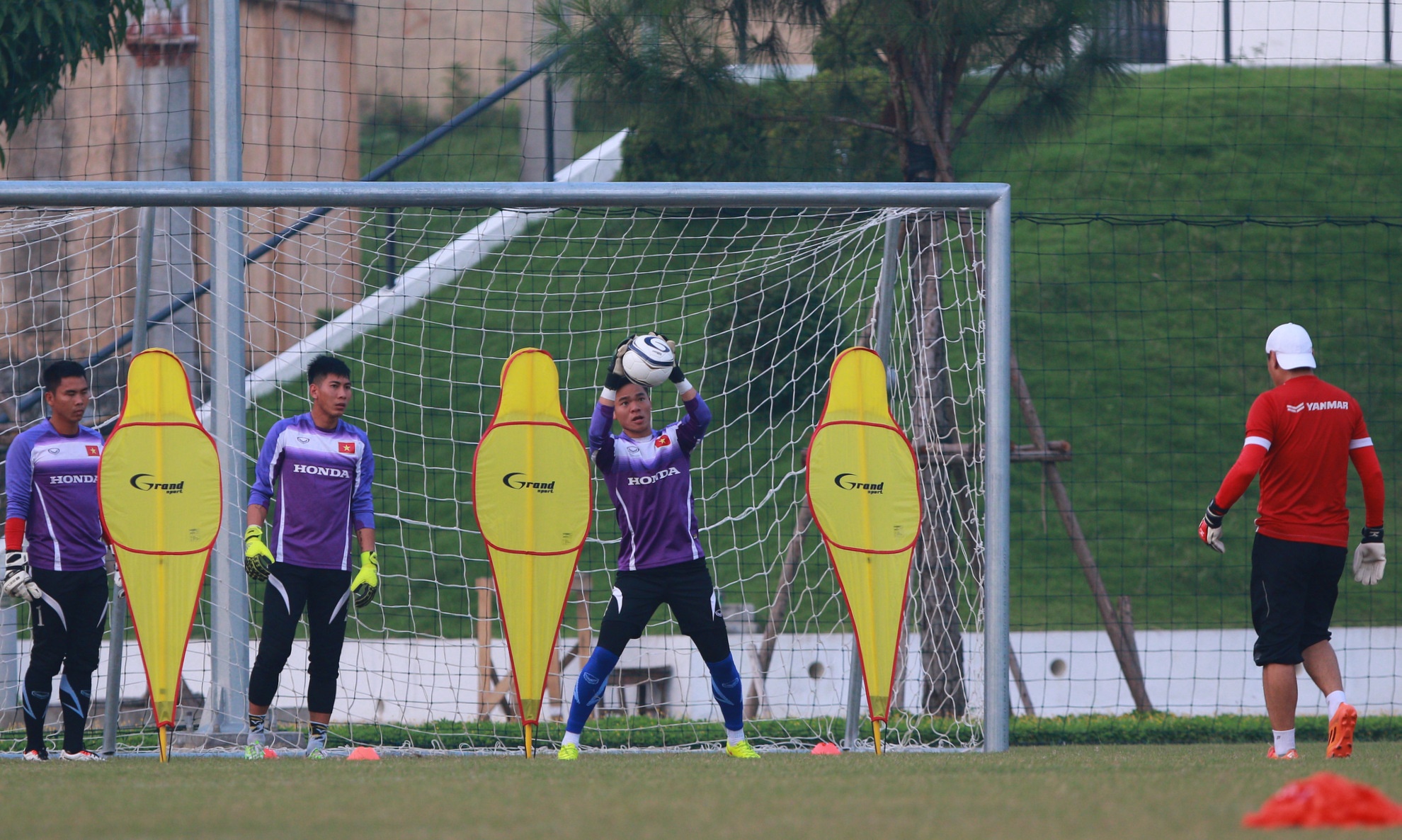 | Ở một góc sân, HLV thủ môn Nguyễn Đức Cảnh (áo đỏ) rèn phản xạ cho Nguyên Mạnh, Vĩnh Lợi, Hoài Anh... |