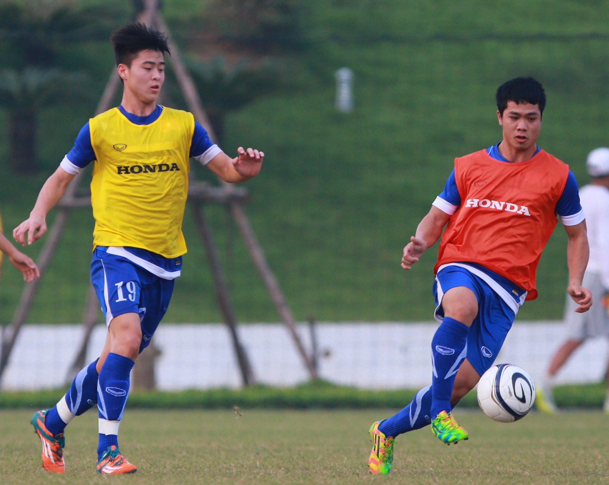 | Sau màn khởi động, HLV Miura chia đội tuyển làm 3 nhóm chơi bóng ma ít chạm. 2 người đuổi bóng sẽ cầm áo bib màu xanh trên tay. Trung vệ Việt kiều Đặng Văn Robert (phải) hào hứng khi chạm trán với Công Phượng trong màn so tài về tốc độ và kỹ thuật. |