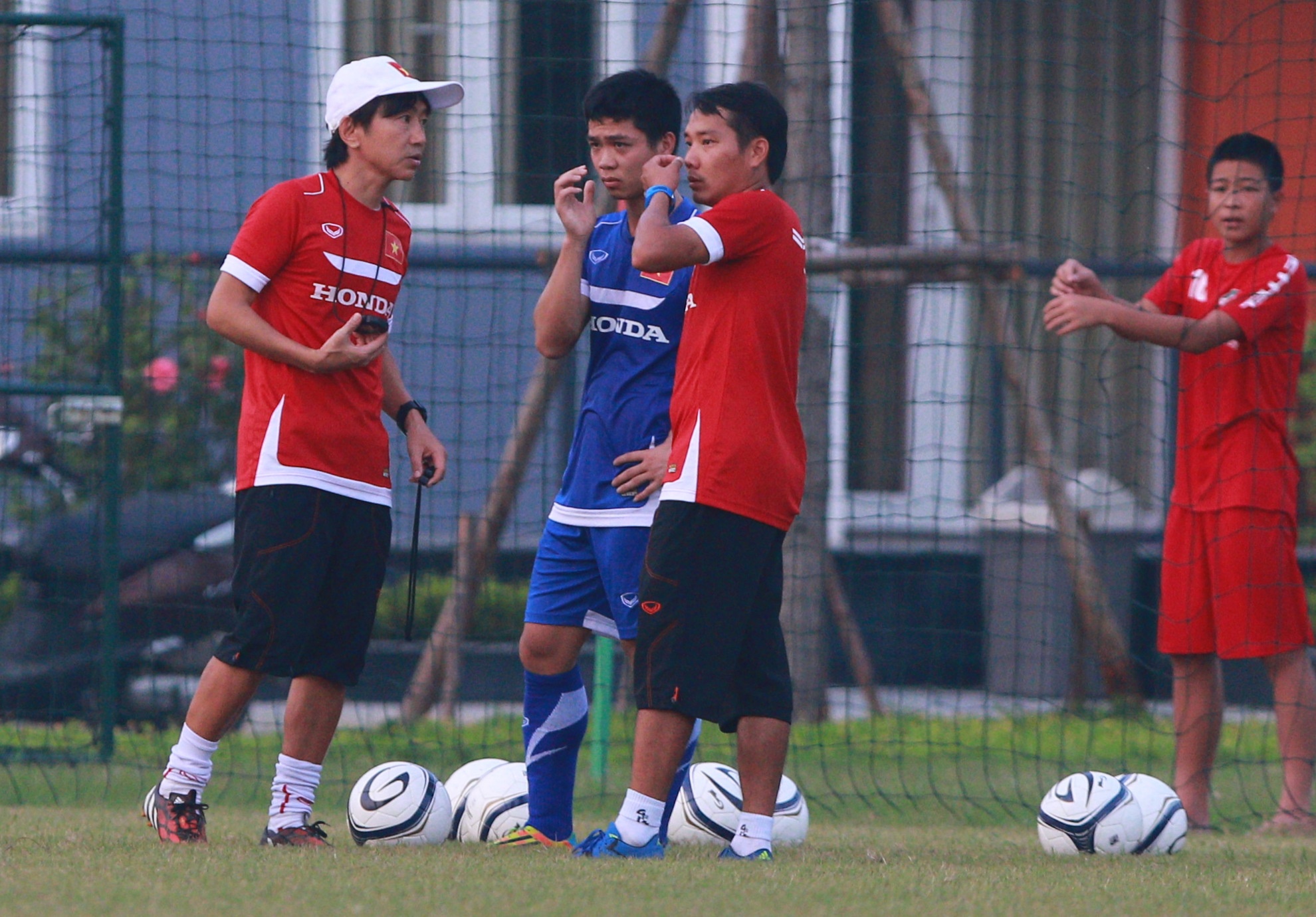 | Sau khoảng hơn 30 phút chơi đùa với bóng, HLV Miura chia tuyển Việt Nam làm 3 đội (mỗi đội 8 người) đá đối kháng nửa sân. Nhà cầm quân người Nhật Bản liên tục hô hào hàng tiền đạo phải tích cực áp sát ngay sau tình huống để mất bóng. |