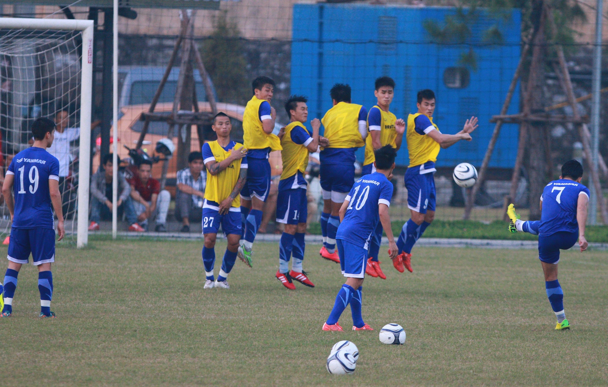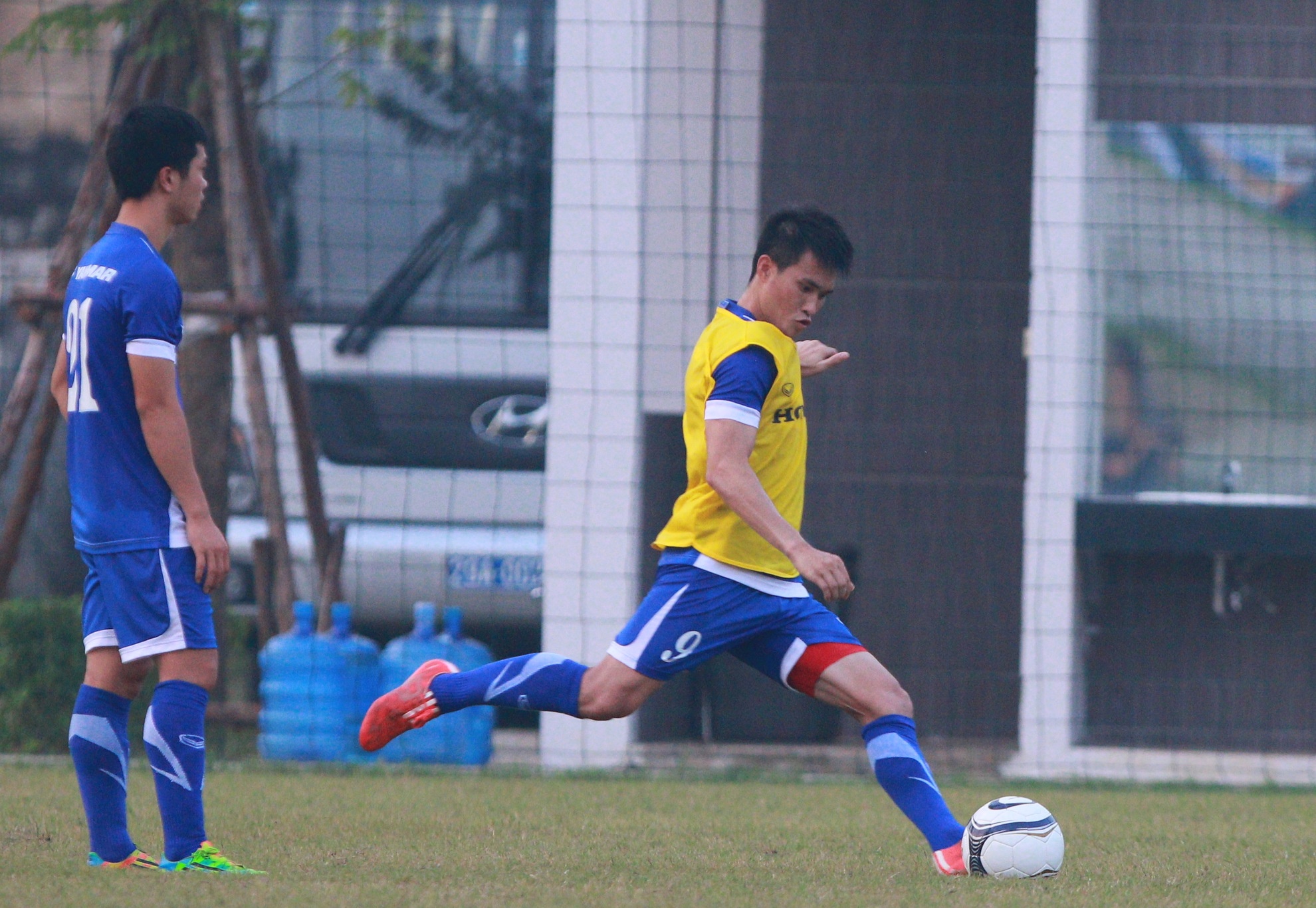 | Cuối buổi tập, Hoàng Thịnh và Văn Quyết tập sút phạt hàng rào về phía khung thành thủ môn Vĩnh Lợi, Nguyên Mạnh. |